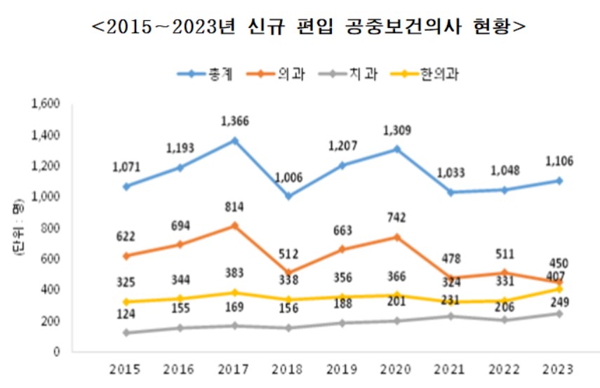 2015~2023년 간 신규 편입 공중보건의사 현황 그래프. 출처: 의사신문
