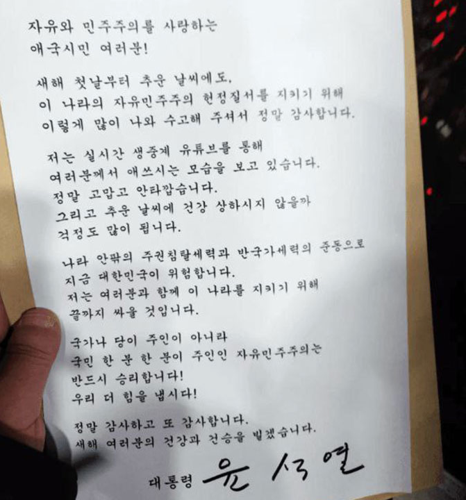 대다수의 시민들은 아직 이들을 몰상식한 구시대적 존재 정도로 치부하지만, 무려 국군통수권자인 대통령이 이들과 유사한 정세인식을 공유하며 내란을 획책했다는 것은 이러한 담론의 확산과 그 실천적 형태인 백색테러의 위험성을 무엇보다 경계해야만 하는 이유일 것이다. 한남동 관저에서 농성 중인 윤석열이 탄핵 반대 시위대에게 보냈다고 알려진 편지의 내용은 윤석열 스스로가 혐오에 기반한 음모론에 찬동함을 넘어 이미 이를 정치적으로 이용하고 있음을 확인시켜 준다.
