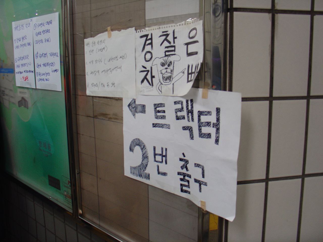 남태령에서 밤을 지새운 많은 사람들의 소식을 접하고, 12월 21일 일요일 오후 2시경 남태령역에 도착했다. 사당에서 출발한 4호선 지하철에는 정말 많은 사람들이 타고 있었는데, 이들의 대부분이 남태령에서 내렸다. 긴 계단은 사람으로 가득 차 있었고, 올라가자 나온 개찰구 앞에는 역무원이 공간 확보를 위해 확성기와 빨간 봉을 들고 사람들에게 이동 방향을 지시하고 있었다. 개찰구 밖에는 윤석열 퇴진운동 주최측에서 배포한 손피켓을 돗자리 삼아 앉아 있는 사람들도 여럿 보였다. 2번 출구 근처에 붙은 '경찰은 차 빼'라는 손글씨와 함께 집회 장소를 안내하는 표지판이 인상적이었다.
