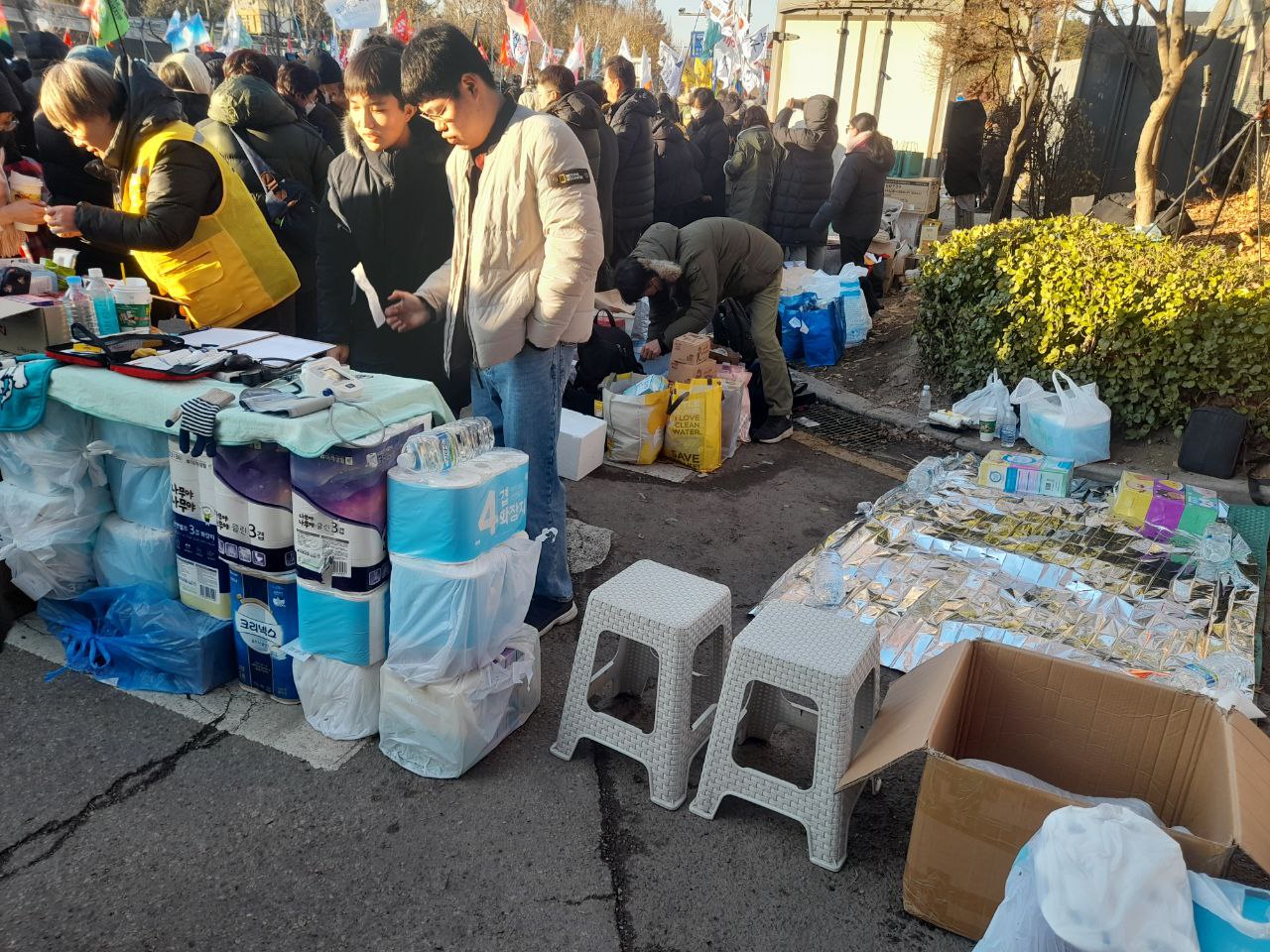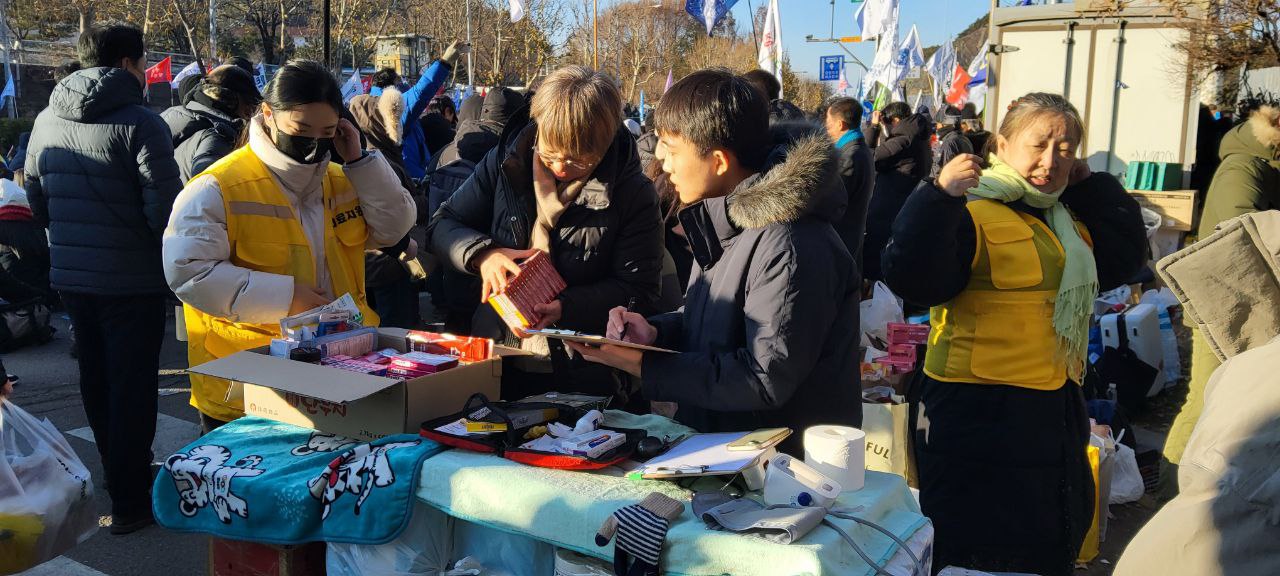 남태령역 2번 출구로 나가서 친구를 만나 출구 근처에 설치된 간이 의료부스로 향했다. 이번 퇴진집회 내내 운영 중인 의료부스는 내가 현재 활동하는 시민단체인 '건강권 실현을 위한 보건의료단체연합(보건연)'에서 운영하고 있다. 이는 '인도주의실천의사협의회(인의협)', '행동하는 간호사회', '노동건강연대' 등 주요 보건의료운동 단체들의 연대체이다. 평소에는 주최 측에서 의료부스로 사용할 수 있는 천막 하나를 주었고, 특히 대학생인 내가 의료지원 부스에서 할 수 있는 역할은 크지 않았다. 실질적으로 할 수 있는 의료 행위가 거의 없을뿐더러 환자가 많이 발생할 일이 없었기 때문이었다. 그래서 주로는 학생회원들과 집회 자체에 참여하거나, 의료민영화 반대 전단지를 배포하거나, 깃발을 드는 등 의료지원과 직접적으로는 관련되지 않은 일을 많이 해 왔다. 그러나 그 날의 상황은 조금 달랐다.