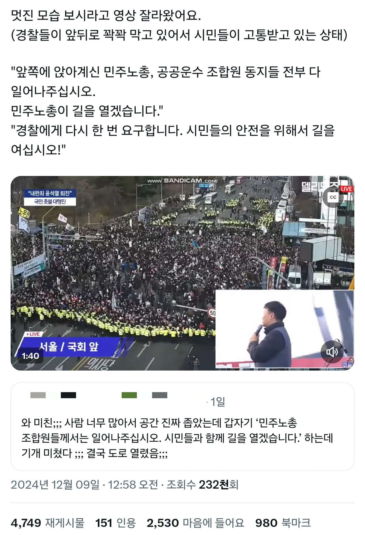 국회 앞과 광화문에서 시작하여 남태령, 안국역까지 이어진 연대의 물결은 우리 운동의 무한한 확장 가능성을 보여준다. 각자의 부문에서, 현장에서 많은 사람들을 만나고 함께 싸우자. 퇴진을 넘어, 광화문 광장을 넘어 열릴 평등한 세상을 함께 꿈꾸고 있는 많은 사람들이 있다.