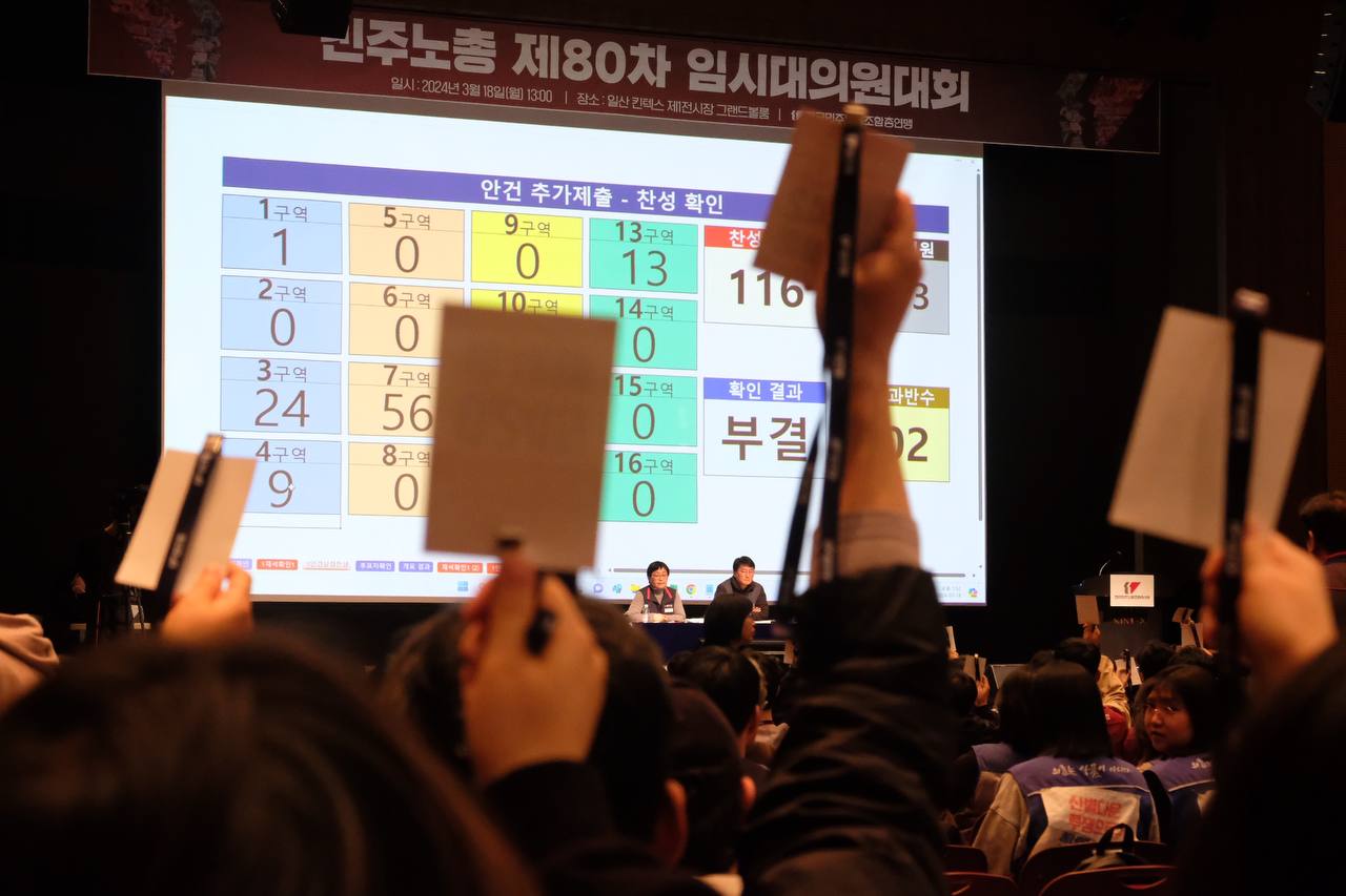 지난 2월 11일 경기도 일산 킨텍스에서는 전국민주노동조합총연맹(민주노총) 제82차 정기대의원대회(대대)가 개최되었다. 다행스럽게도(?) 예년과 다르게, 민주노총은 이번 정기대의원대회에 상정된 모든 안건을 처리했다.