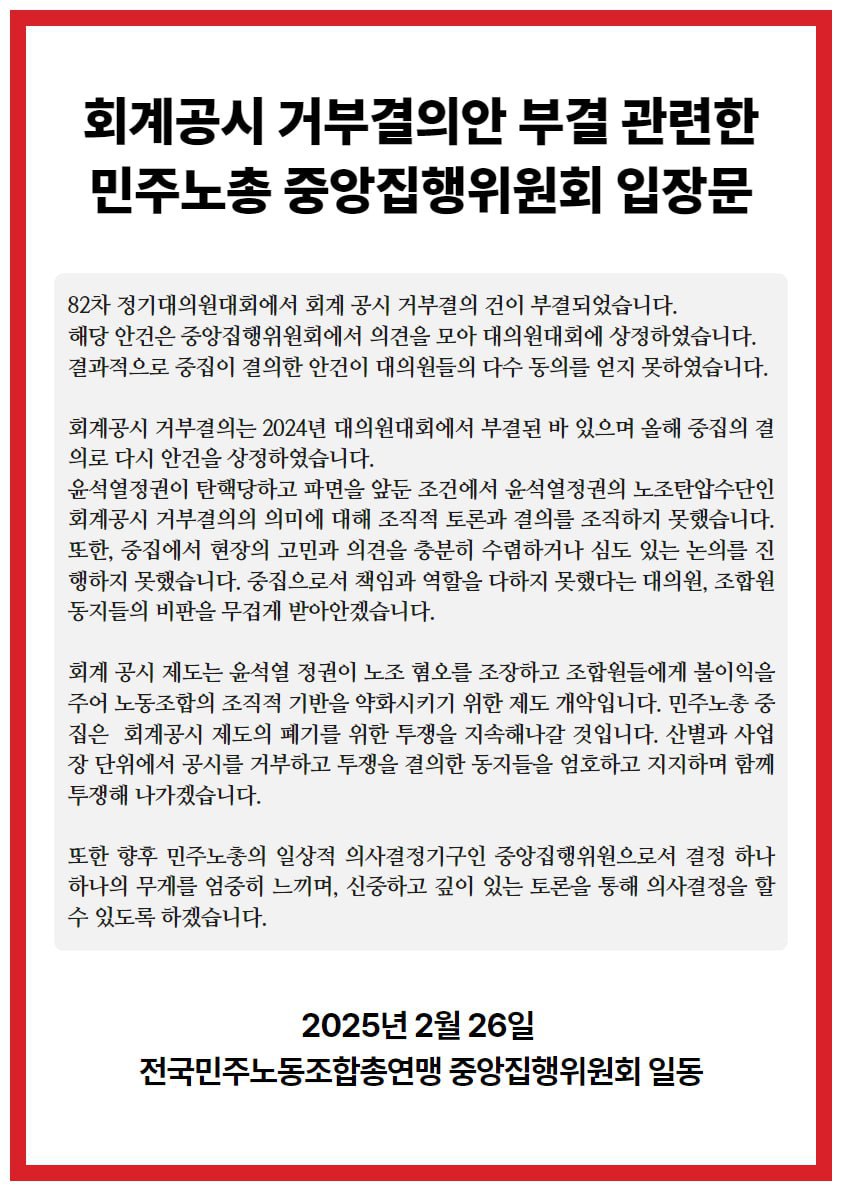 대대 이후 2주가 지난 2월 26일, 민주노총 중앙집행위원회는 회계공시 거부결의안 부결 관련 입장문을 내놓았다. 중집은 입장문을 통해 "윤석열 정권의 노조탄압수단인 회계공시 거부결의의 의미에 대해 조직적 토론과 결의를 조직하지 못했다"며, "중집으로서 책임과 역할을 다하지 못했다는 대의원, 조합원 동지들의 비판을 무겁게 받아안겠다" 밝혔다. 더불어 해당 입장문에서는 "산별과 사업장 단위에서 공시를 거부하고 투쟁을 결의한 동지들을 엄호하고 지지하며 함께 투쟁해 나가겠다"고도 밝히고 있다.