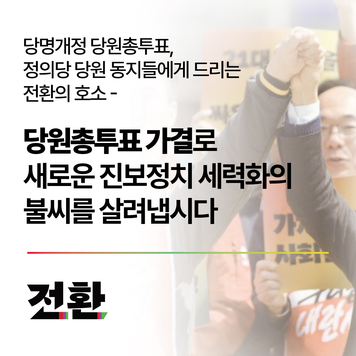 오는 5월 2일부터 당원총투표가 시작됩니다. 다시 한 번 정의당 당원 동지들께 호소드립니다. 당명 개정 당원총투표에 찬성해 주십시오. ‘민주노동당’이라는 임시 당명에 던지는 당원 동지들의 찬성표는 단순히 당명에 대한 찬성표가 아니라 진보정치와 사회운동이 함께 만들어 왔고 또 더 크게 만들어나갈 연대에 대한 찬성표입니다. 전환은 지금까지 그래 왔듯이 진보정치가 나아갈 더 넓은 길을 만들어나가는 데 부여된 책임을 앞으로도 결코 마다하지 않겠습니다.