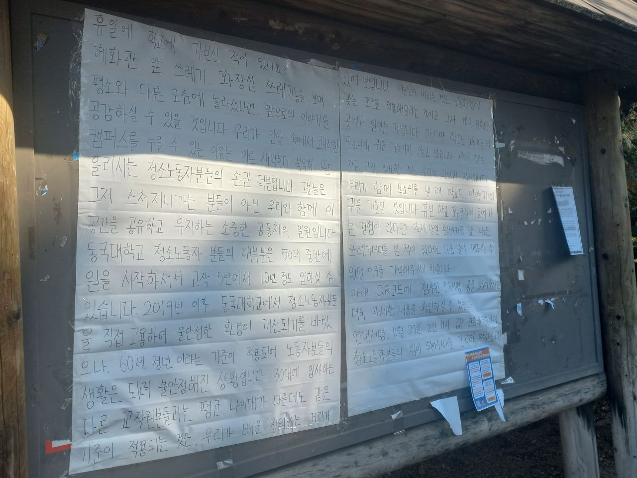 동국대학교 청소노동자들이 투쟁을 시작한 지 어느덧 석 달이 넘었다. 8월의 뜨거운 여름날 시작한 투쟁이 어느덧 소복히 쌓인 눈길 위에서 계속하게 되었다. 누가 이들을 칼바람 속 추위에 버려 두었나? 매주 화요일과 목요일마다 진행하던 집회를 매일 진행하는 것으로 바꾸고 11월 27일에는 학생들의 연대 선언 기자회견과 집중집회까지 열렸지만, 동국대학교는 여전히 묵묵부답인 채 본관 앞의 현수막만 갈아치우고 있다. 부처의 자비를 말하는 동국대학교의 정신은 청소노동자들의 투쟁 앞에 사라졌다. 동국대학교 청소노동자들은 어째서 바깥으로 나왔는가? 왜 이들은 소중한 점심시간의 반을 할애하면서까지 목소리를 높이고 있는가?