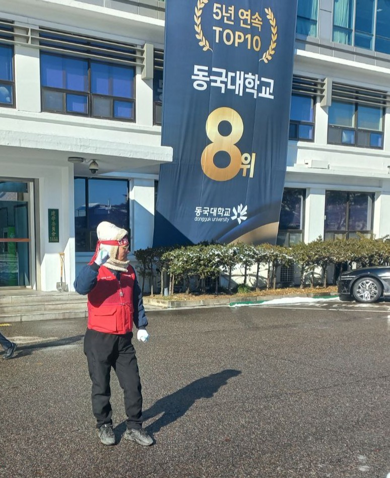 빛나는 동국대학교의 이름 아래 청소노동자는 없다. '학교법인 동국대학교'라는 건학위원회의 현판은 늘 야속하게만 보인다. 글이 탈고되는 12월 11일 오늘로 동국대학교 청소노동자들이 투쟁을 시작한 지 113일이 되었다. 어느덧 날씨는 완연한 겨울이 되어 내뿜는 숨은 하얀 입김이 되어 날아가고, 부처님 성상과 코끼리상 위에도 소복하게 눈이 쌓였다. 이토록 어려운 상황에서 투쟁하는 청소노동자 당사자들마저 연대방문을 온 학생들을 걱정해 장갑을 벗어 주는 자비를 보인다. 그런데 지금 동국대학교에는 자비가 어디 있는가.