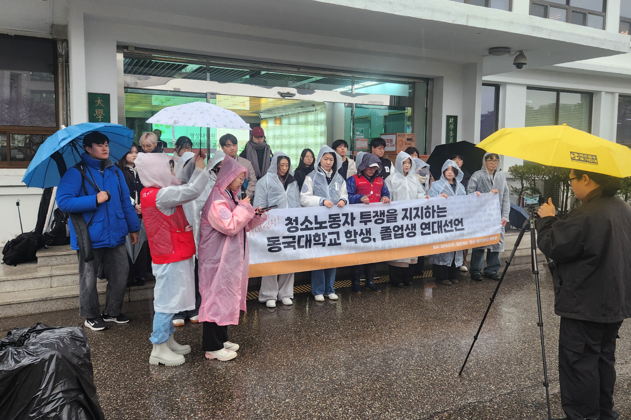 11월 27일은 아침부터 굵은 빗줄기가 내렸다. 추운 기온과 궂은 날씨에도 스무 명이 넘는 학생들이 기자회견에 함께했으며, 연세대 비정규 문제를 고민하는 학생 모임 '살맛'과 투쟁의 미디어 <스튜디오R>에서도 연대했다. 연서명 결과를 발표한 뒤에는 학생들의 연대발언이 이어졌다. 중앙동아리 맑스철학연구회의 부회장인 백종호 학우는 학교가 청소노동자를 대하는 태도가 동국대학교의 교육 정신에 한참 어긋난다며 "지혜롭지도, 자비롭지도, 정진하지도 않는 학교측의 태도에서 도대체 학생들은 무엇을 배울 수 있겠습니까?"라는 질문을 던졌고, 국어국문문예창작학부 25학번인 김태은 학우는 "학생, 교직원과 마찬가지로 우리 대학의 구성원인 청소노동자를 이와 같이 비인간적으로 대하는 학교의 눈에는 학생인 내가 '외부로부터 훌륭한 평가를 받기 위한 학교 운영 자금을 보태는 등록금 자판기'로 보여질 것 같다는 생각에 두려워졌다"며 학교의 비민주적 행동을 날카롭게 비판했다.