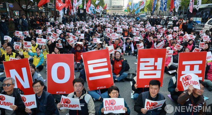 이번 민주노총 노동자대회의 발언 및 연설들도 이와 마찬가지였습니다. 대체로 그런 맥락과 우리 운동의 역할, 과제를 정확하게 짚기보다는 마치 트럼프라는 대상에 대한 분노를 쏟아내며 '민족적 울분'을 해소하려는 듯한 내용들이 많았는데요, 그런 방식으로 해소될 수 있는 문제가 아니라는 것을 좀 더 명확히 했으면 좋겠습니다. 최근 민주노총을 비롯한 운동진영의 반트럼프 운동이 주로 그렇게 진행되는 것처럼 보여서 다소 안타까웠고, 이런 관점에서 이후에도 운동의 국제주의가 지향해야 될 가치에 대해 분명히 하는 것이 필요하다는 말씀을 드리고 싶습니다.