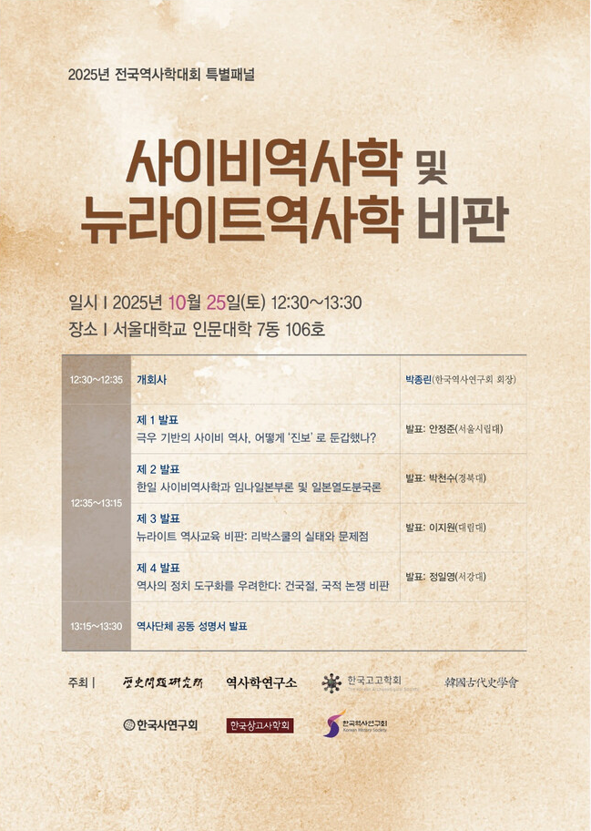 올해 10월 24일~25일 양일간 개최된 제68회 전국역사학대회의 특별패널은 사이비역사학 및 뉴라이트역사학 비판이라는 주제로 열렸다. 이 자리에 참석한 수많은 학자 및 학회들은 이전에도 사이비 역사학과 뉴라이트를 비판하는 성명을 여러 차례 발표한 적이 있다. 이들은 이번 대회 이후 이재명 대통령의 발언을 규탄하며 '사이비역사' 추방을 요구하는 공동성명을 발표했다. 글을 마치며 아래 해당 성명서를 첨부한다.