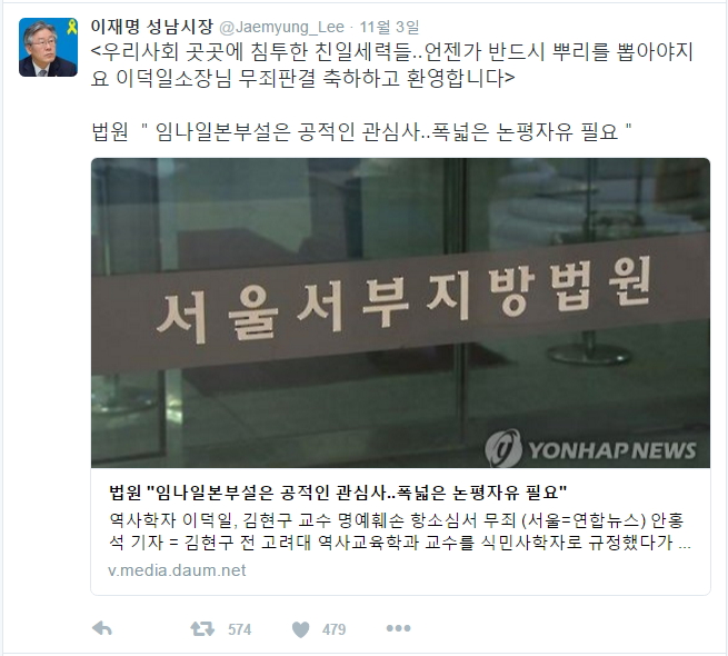 이덕일의 무죄판결을 축하 및 환영하는 이재명 당시 성남시장