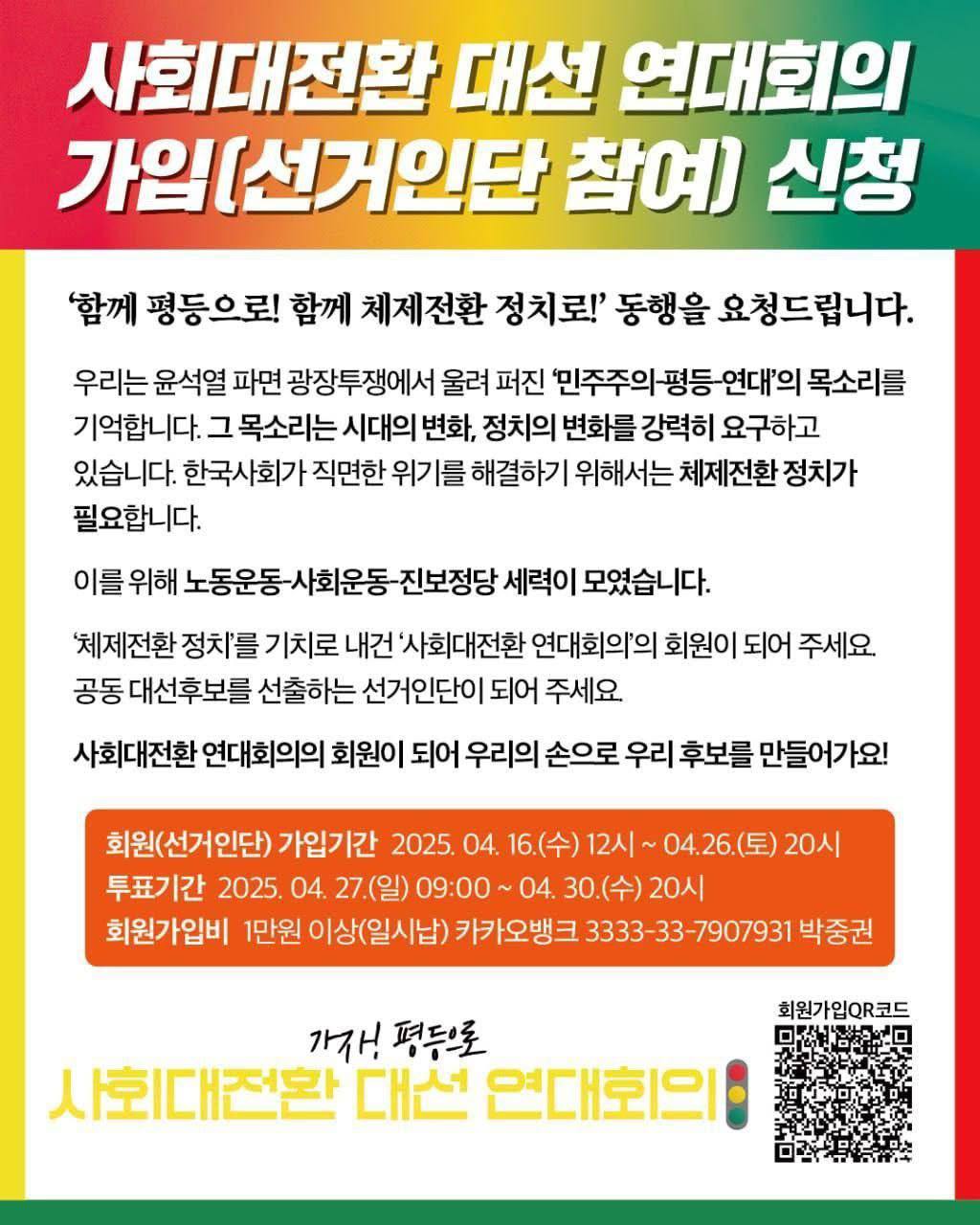 '체제전환 정치'를 기치로 내건 '사회대전환 연대회의'의 회원이 되어 주세요. 공동 대선후보를 선출하는 선거인단이 되어 주세요.