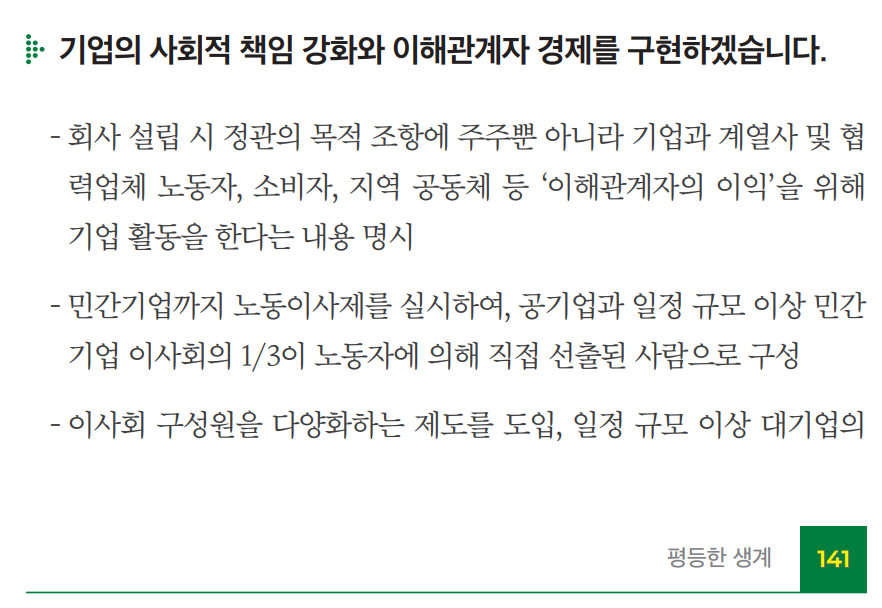지난 제22대 총선에서 녹색정의당은 경제 공약 중 하나로 회사를 설립할 때 기업의 정관에 주주뿐 아니라 협력업체, 노동자, 소비자, 지역공동체 등 ‘이해관계자 모두의 이익’을 위해 기업활동을 함을 명시하도록 하겠다는 공약을 내세운 바 있습니다. 기업의 정관은 기업의 성격을 규정하는 근본 규칙으로, 상법보다도 우선순위로 기업에 적용됩니다. 이처럼 상법만을 개정하는 것보다 더욱 강력한 개혁을, 더 넓은 이해관계자를 대상으로 실행해야 합니다. 이는 일각에서 우려하는 현 상법 개정안의 한계를 극복하고, 지금 윤석열과 이재명이 외치는 상법 개정안보다 더 넓은 범위에서 많은 서민들의 권익을 보장할 수 있는 방법입니다.