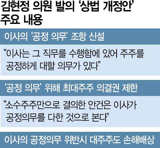 이사는 회사에 대해 충실의무, 즉 회사를 위해 최선을 다해야 한다는 의무가 상법에 규정되어 있습니다. 이사가 회사가 아닌 오너 등 특정인의 이익만을 위할 경우에는 이 규정을 근거로 회사에 손해를 배상할 책임이 있습니다. 그러나 대법원은 지난 2009년 삼성 에버랜드 경영승계 사건 판결에서 현행법상 주주에 대해서는 이런 충실의무와 배상책임이 없다고 해석한 바 있습니다. 이번 상법 개정안의 핵심은 이를 개선하고 확대해 주주의 이익을 보호할 수 있는 근거를 상법에 규정하겠다는 것입니다.
