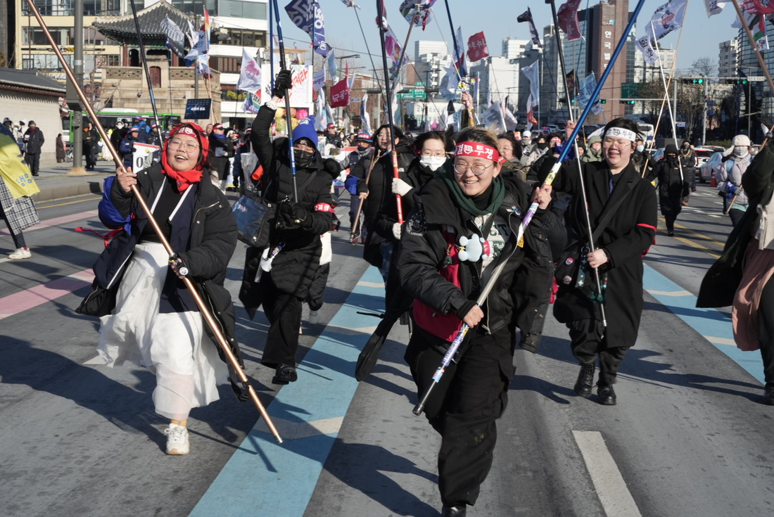 하지만, 글쎄요, 그렇게 말하는 순간 비장하고 굳어 있던 것처럼 보이던 얼굴들이 돌연 아주 크게, 다발들처럼, 펑, 펑, 펑, 목련꽃이 터지는 것처럼 환해졌습니다. 그리고 제 쪽으로 있는 힘껏 손을 흔들어 주셨습니다. 그건 뭐랄까, 이상한 느낌이었습니다. 어느새 그렇게 됐는지 의식하지도 못한 닳고 낡은 마음으로 걷는데, 누군가 갑자기 다가와 하이파이브를 해 주는 것 같은, 그런 이상한 기분. 그 때 이 장면은 무어라고 의미화되지 못한 채 어정쩡하게 제 다른 기억들 사이에 들어가 잊혔다가, 내란의 광장을 따라, 다시 만난 세계를 따라, '그만하라고 했다 민주노총 부른다'의 밈을 따라 천천히 흔들리면서 뒤늦게 자리를 찾았습니다. '동지'라는 색인 아래에요. 그러니까 제게 '동지'라고 하면 그 때 그 장면, 하이파이브를 하는 것 같은 기분이 떠오릅니다.