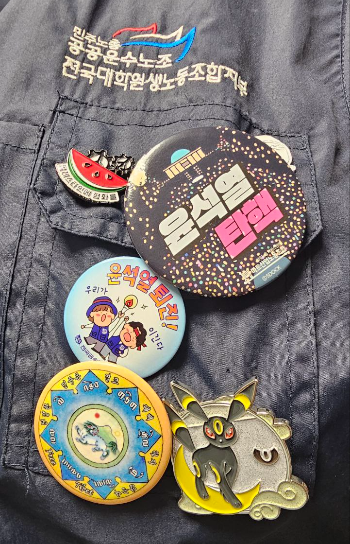 이 글을 쓰는 책상 오른편에는 옷걸이가 있고, 거기에는 제 노동조합 조끼가 걸려 있습니다. 조끼 앞에 붙은 많은 뱃지들과 눈이 마주칩니다. 그 중 하나는 공공운수노조 간부 교육에서 만났던 동지가 주셨던 '블래키' 뱃지입니다. 서글서글 수줍게 웃으시던 그 동지는 제가 가장 좋아하는 포켓몬 중 하나가 블래키라고 하니 통 크게 자기 조끼에 있던 뱃지를 떼어 제게 주셨습니다. "바깥은 혼자 돌아다니기엔 위험하니, 함께 갈 포켓몬을 데려가"라고 말하는 태초마을의 오 박사님처럼 말입니다.