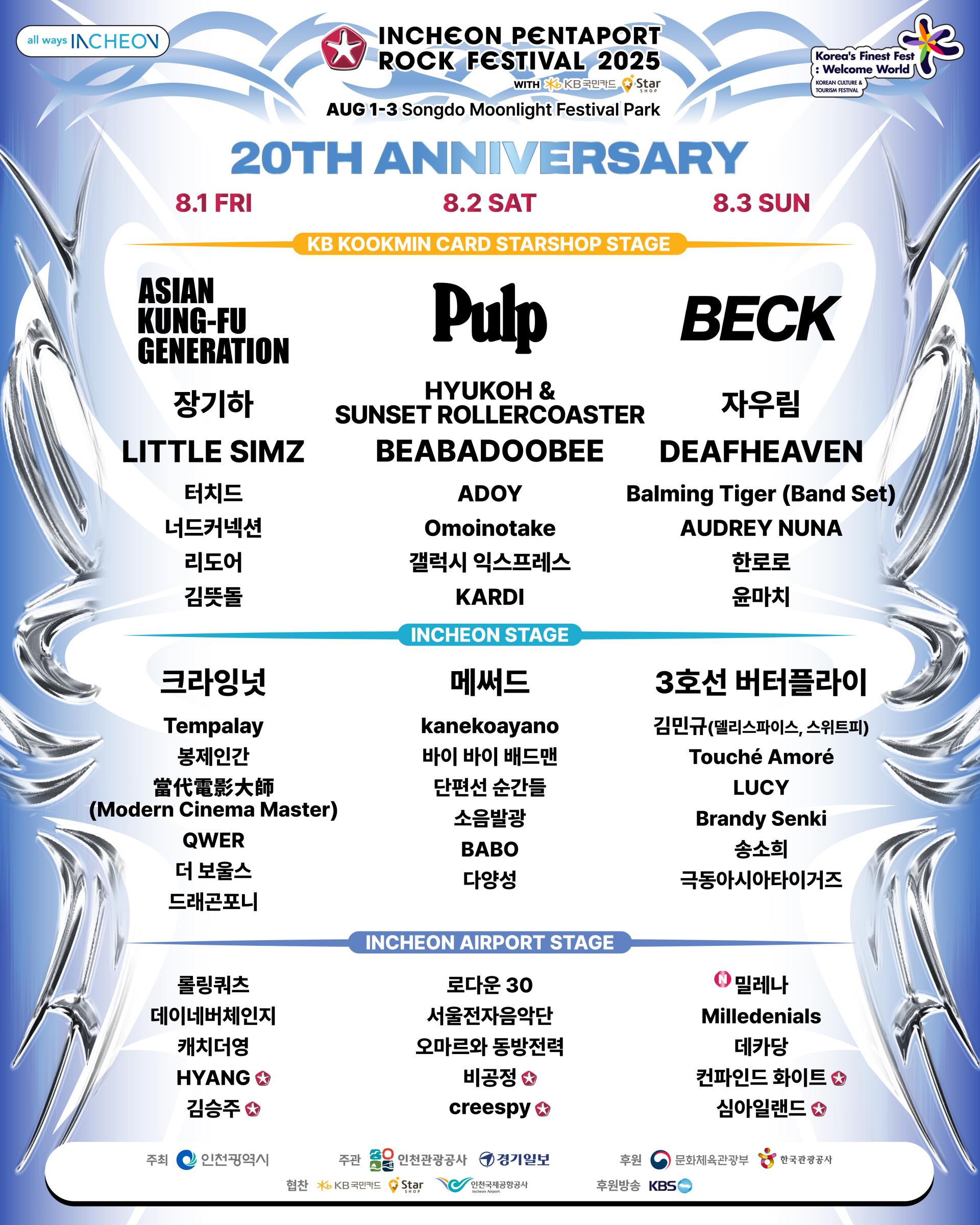 2025년 8월 1일(금)부터 8월 3일(일)까지 개최된 이번 펜타포트는 20주년이라는 이름값에 걸맞지 않는 부실한 운영, 페스티벌 자체의 과도한 자본주의화 등으로 인해 팬들 및 관객들에게 큰 비판을 받고 있다. 입장 대기 관리의 부실로 수많은 관람객들이 2~3시간에 달하는 대기줄을 서야 하기도 했다. 이러한 행사 운영상의 문제점들은 분명히 향후 개선이 필요하겠지만, 그 와중에도 최소한 아티스트 라인업만큼은 분노한 록 팬들의 비판으로부터 벗어나는 데 성공했다. 헤드라이너였던 영국의 전설적인 밴드 펄프(Pulp), 그래미 8관왕의 미국 싱어송라이터 벡(Beck)의 공연을 비롯해 수많은 아티스트들이 비와 폭염 속에서도 열연을 펼쳤다.