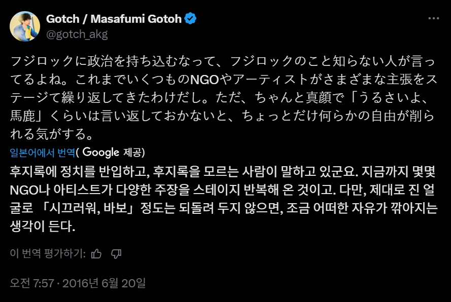 그러나 단순히 일본의 유명 록밴드이고 애니메이션 삽입곡 때문에 유명해진 밴드였다고 한다면, 개인적인 취향의 선호는 될 수 있었을지언정 사회운동·진보정치를 주제로 삼는 웹진에 소개할 이유는 되지 못했을 것이다. 12년 만의 내한공연이었던 2025년, 고토 마사후미는 팔레스타인 연대를 상징하는 수박(팔레스타인 국기와 유사한 색으로, 1967년 이스라엘의 강제점령 이후 팔레스타인 저항 운동의 상징으로 통용된다) 티셔츠를 입고 펜타포트 무대에 섰다. 무대 뒤쪽의 앰프 위에 설치된 'NO WAR' 조형물과 함께였다. 팔레스타인 의제에 대한 관심이 상대적으로 덜한 한국에서 큰 반향을 일으키지는 못했지만, 고토 마사후미는 <구르는 바위, 너에게 아침이 내린다>를 부르던 도중 티셔츠에 그려진 수박을 손가락으로 가리키기도 했다. 어떤 가사였을까?