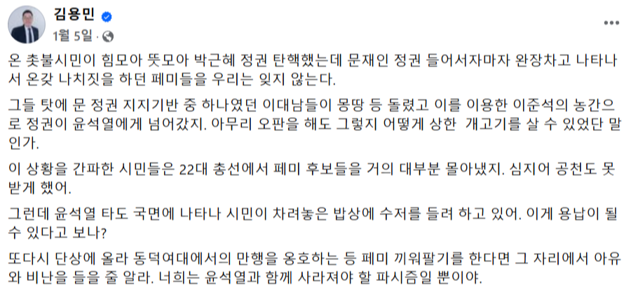 유사한 논리로, 민주당 계열의 유명 정치 유튜버이자 인플루언서인 김용민은 최근 들어 "페미니즘은 파시즘" "여성의당에 가라"2 등 페미니즘과 여성정치에 대한 혐오를 기존보다 더욱 강하게 표출하고 있으며 이는 상술한 혁신회의 등의 민주당 당원들에게 적잖은 호응을 얻고 있다. 김용민을 포함한 민주당계 유력 인플루언서들은 촛불행동과 함께 행동하며 박원순 성폭력 사건을 옹호하기도 한다. 이는 일견 윤석열 파면으로 인해 하나된 것으로 보였던 광장에 여전히 잠재되어 있는 거대한 균열을 다시금 상기시킨다. 오프라인 광장에서는 쉽게 내뱉을 수 없어진 혐오와 배제의 표현들을, 민주당의 인플루언서들은 여전히 온라인에서 선전선동의 수단으로 사용하며 자신들의 지지층을 결집하고 있는 것이다.