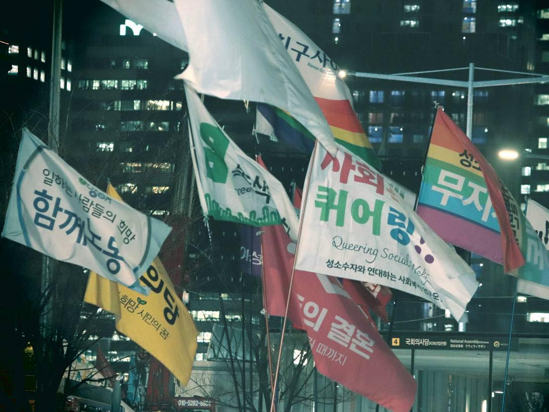 역설적이지만, 이런 광장의 진화와 다양성의 증진이 다시금 확인해 주는 것은 광장의 '우리'가 전혀 단일하지 않다는 것이다. 애초에 선 자리가 서로 다른 이들이 모여 이 다양성의 광장을 만들었으니 말이다. 계엄이라는 초현실적 사건 덕에 민주공화정을 함께 걱정해야만 했던 이들 사이에는 이 공화정이 시민으로 인정하지 않았던 비시민들이 있다. 한 평생을 일한 일터에서 하루아침에 해고되어 철탑에 제 발로 오르고, 스스로의 몸을 1평도 안되는 상자 속에 구긴 이들이 거리에 나왔다. 사랑해 마지 않는 이가 단지 동성이라고 친구, 동거인으로 둔갑하여 살아야 하는 이들도 이 거리에 있었다. 대중교통을 한번 타기 위해 휠체어를 굴리며 오늘은 굴러떨어져 죽지 않을지 걱정하던 이들도 거리를 지켰다.