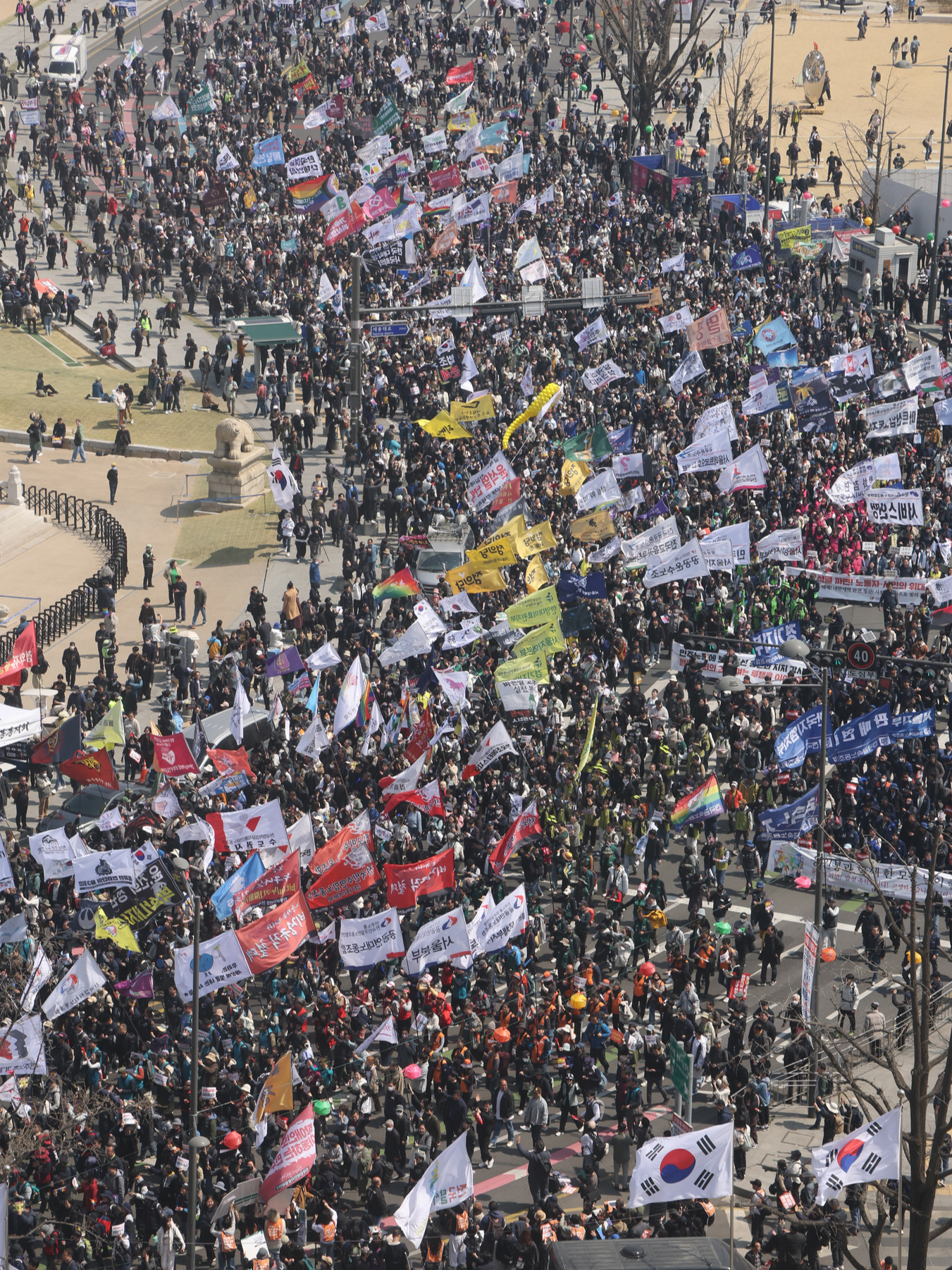 선고 직후 시작된 행진, 수많은 깃발들이 형형색색 휘날리던 와중 유독 성소수자 단체들의 깃발이 눈에 들어왔다. 당연히 당시 서 있던 공간에서 가장 가까운 대오가 성소수자 단체, 진보정당, 노동조합이었으니 그랬을 것이다. 비상행동 의장단이 성명을 발표하고 머지않아 차량 한 대가 집회 인파를 가르며 나타났다. 차량에 설치된 골리앗 크레인에 오른 사회자는 연신 "감사합니다, 사랑합니다, 우리가 승리했습니다"를 외치며 사람들을 향해 손 흔들었다. 차량을 따라 광화문으로 행진하던 인파들은 그 목소리에 환호하고 함께 외쳤다. 우리가 승리했다! 시민이 승리했다! 그런데, '우리'?