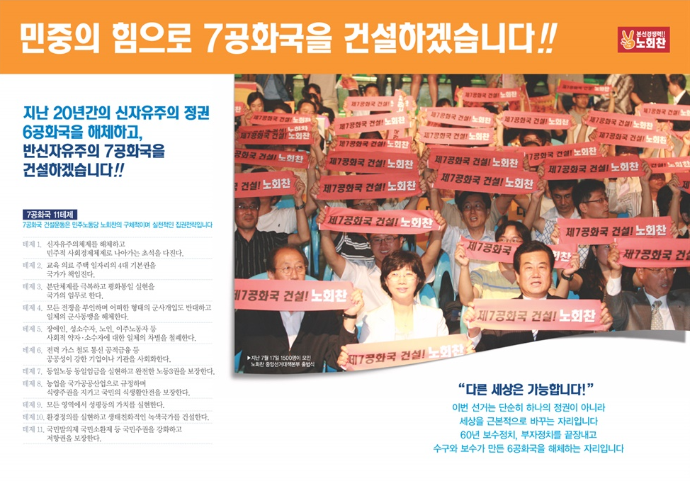 노회찬은 제7공화국 수립을 위한 구체적인 11개의 테제를 제안한다. 해당 테제들은 노동('<제7공화국>은 동일노동 동일임금을 실현하고, 완전한 노동3권을 보장한다')과 사회권('<제7공화국>은 교육, 의료, 주택, 일자리를 국가가 책임진다' '제7공화국>은 전력, 가스, 철도, 통신, 공적금융 등 공공성이 강한 기업이나 기관을 사회화한다')은 물론이고 농업('<제7공화국>은 농업을 국가공공산업으로 규정하며, 식량주권을 지키고 국민의 식생활안전을 보장한다'), 차별철폐와 성평등('<제7공화국>은 장애인, 성소수자, 노인, 이주노동자 등 사회적 약자.소수자에 대한 일체의 차별을 철폐한다' '<제7공화국>은 모든 영역에서 성평등의 가치를 실현한다'), 생태('<제7공화국>은 환경정의를 실현하고 생태친화적인 녹색국가를 건설한다'), 반전평화('<제7공화국>은 분단체제를 극복하고 평화통일 실현을 국가의 임무로 한다')27 등 대중적인 공감을 불러일으킬 만한 진보적인 의제들로 이루어져 있다.