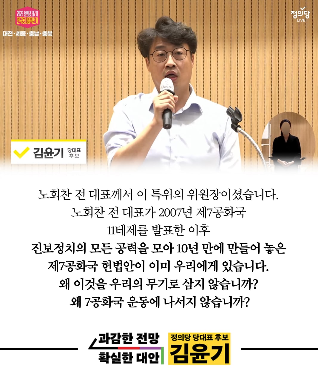 더불어 이를 현실에서 실현하기 위해 노동자 대표가 참여하는 경제 국가기구인 '평등경제위원회' 설치, 현재의 건강보험체계에서 조세지출 방식 국민건강체계로의 점진적인 전환, 한반도의 평화체제와 비핵지대화 실현, 영세중립국 천명, 성소수자 가족 등 다양한 생활동반 가정 보장, 분권적 재생가능 에너지 체제 설립, 국민탄핵제와 국민소환제 보장 등의 구체적인 방안들 역시 명시되어 있다. 비록 경선에서 권영길 후보의 당선으로 인해 제7공화국 정치운동은 그저 하나의 제안으로만 남게 되었지만, 이 제안의 의의는 당시 한국 진보진영이 최초로 제시한 87년 체제 극복을 위한 구체적 제안이라는 데에 있다. 이 때 제시된 '제7공화국' 슬로건은 이후 2022년 김윤기 정의당 당대표 후보의 제7공화국 건설운동 공약28, 2024년 제22대 총선 녹색정의당의 제7시민공화국 개헌 공약29 등으로 계승된다.