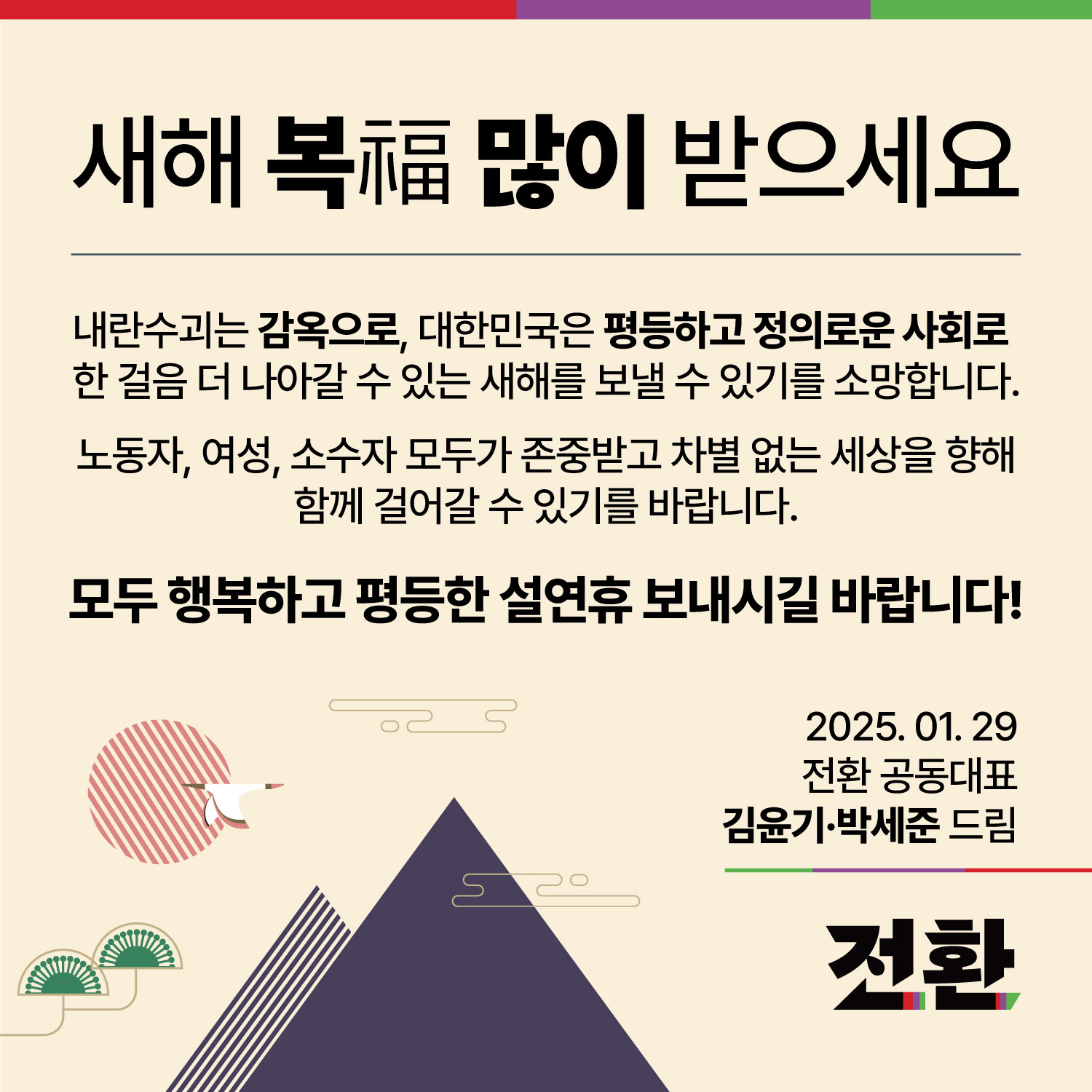 동지 여러분, 전환 공동대표 김윤기, 박세준입니다. 윤석열 일당의 내란에 맞서 민주공화국을 지켜내기 위한 투쟁에 수고 많으셨습니다. 설연휴만큼은 어느 자리에서건 사랑하는 분들과 여유롭고 따뜻한 시간 보내시길 바랍니다.