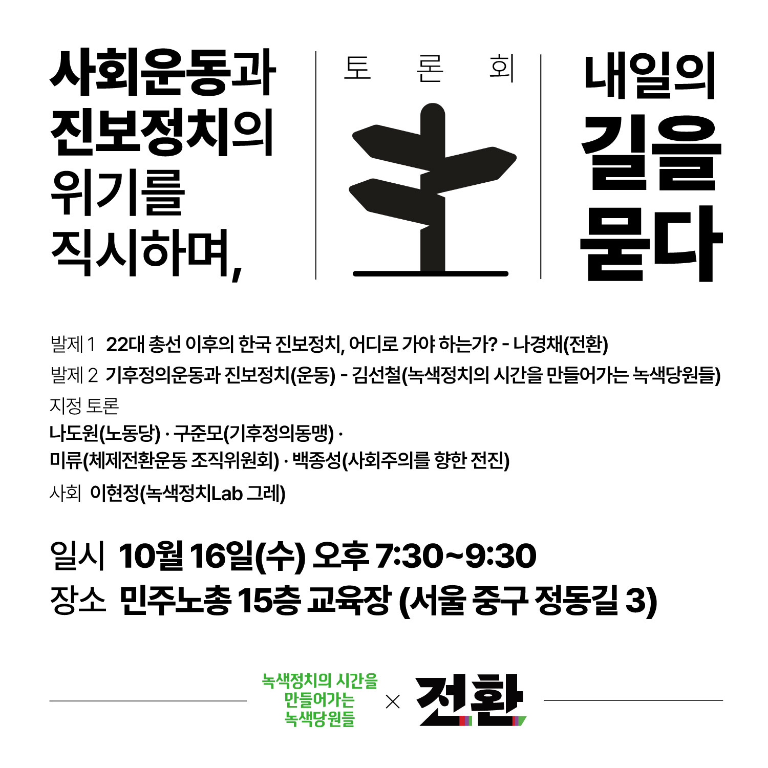 사회운동단체 전환과 녹색당 내 의견그룹인 '녹색정치의 시간을 만들어가는 녹색당원들'(이하 녹정시)가 공동으로 주최하는 토론회가 오는 10월 16일 개최된다. <사회운동과 진보정치의 위기를 직시하며, 내일의 길을 묻다>라는 제목으로 열리는 이번 토론회에는 현 시기 국내 주요 사회운동 및 진보정치 단체들이 발제와 지정 토론으로 참석하여 사회운동, 진보정치의 향후 방향성을 함께 이야기할 전망이다.