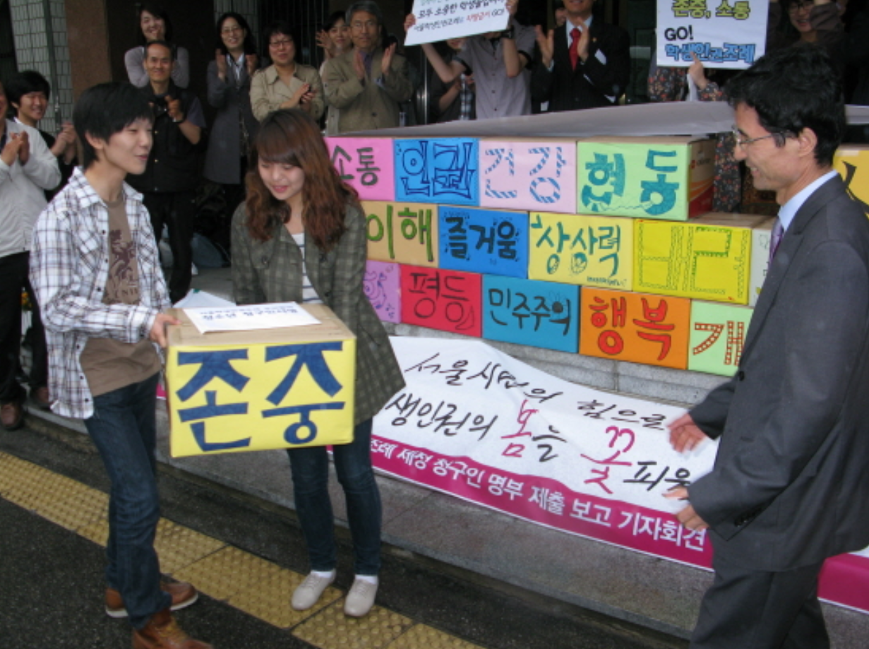 아시다시피 얼마 전 서울에서는 학생인권조례가 폐지되었습니다. 지금도 가끔 그 당시 함께 활동했던 사람들과 만나서 이야기를 나눌 때가 있는데요, 학생인권조례의 폐지가 많은 활동가들에게 좌절을 남겼겠지만 저는 그럼에도 실제 학생인권조례가 만들어낸 많은 변화가 있었다고 생각합니다. 체벌이 폭력이라는 사회적 인식을 남긴 것, 두발규제 폐지 등은 학생인권조례가 남긴 분명한 성과일 테고, 저 개인적으로는 당시 주민발의를 통해 많은 논쟁과 논란을 뚫어내고 시의원들을 움직이게 하는 과정들을 보며 사회적 변화를 만드는 방식이 어떻게 되어야 하는지를 많이 고민하게 된 것 같아요. 그런 면에서 청소년 인권운동은 지금도 저에게 사회변화나 운동을 어떻게 대해야 하는지의 하나의 기준입니다. 정파 운동이나 당 운동이 아니라 인권운동을 시작점으로 삼았던 것이 운동과 정치에 대한 지금의 감각을 다지는 데 많은 영향을 끼쳤던 것 같습니다.