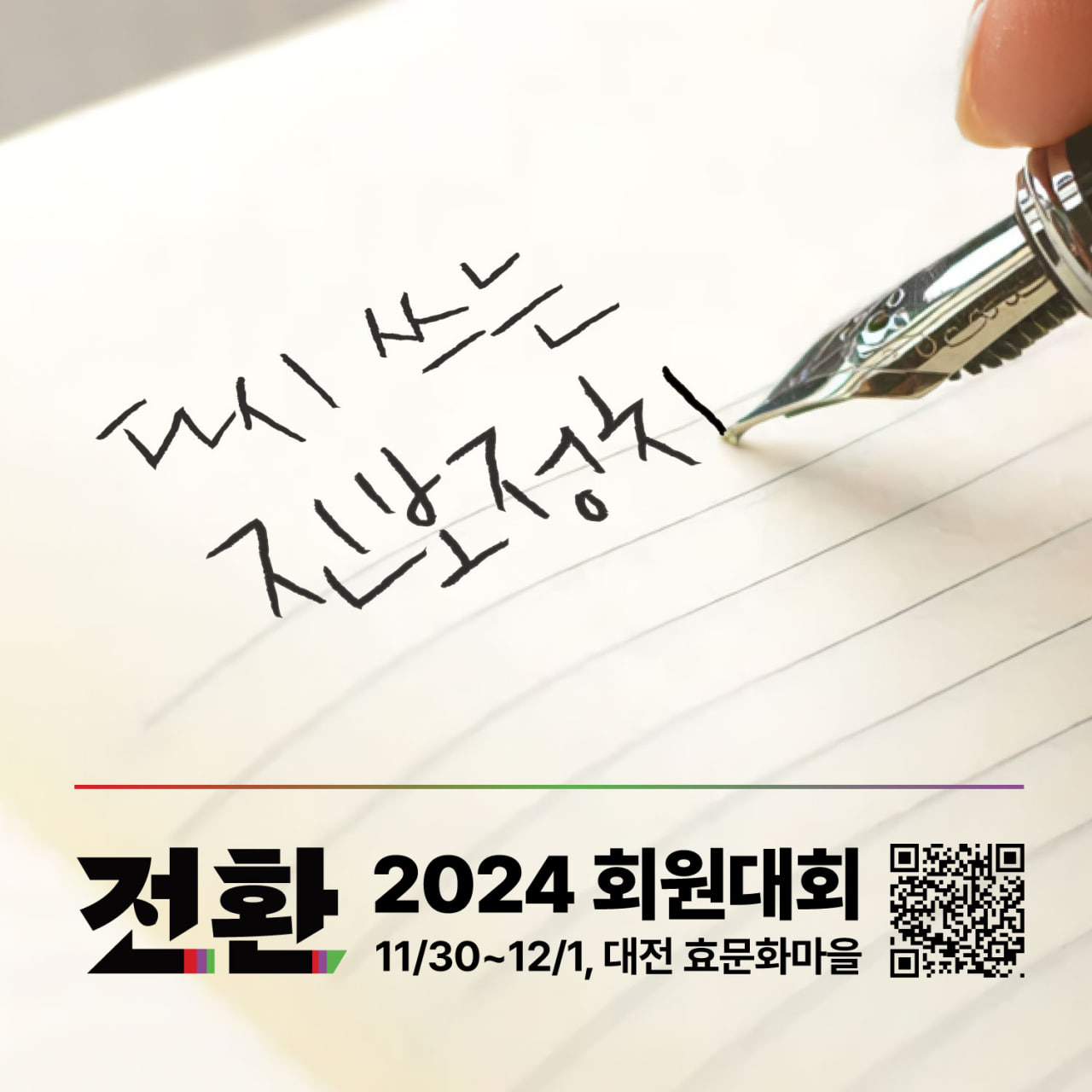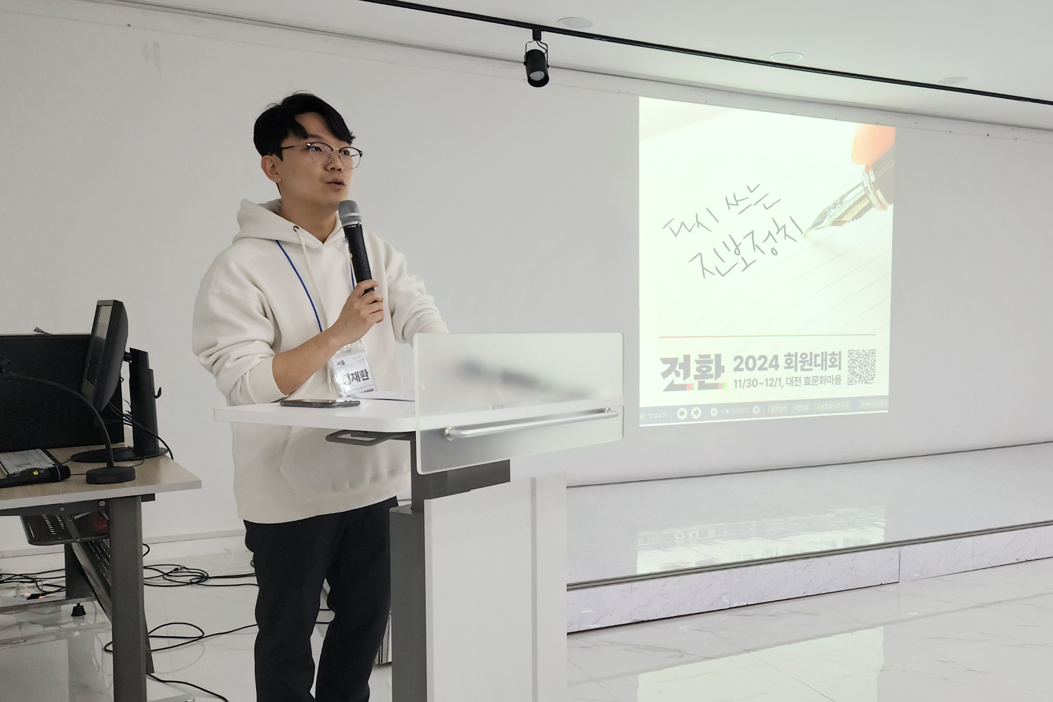 전환은 지난 11/30(토)~12/1(일) 이틀 간 대전 효문화마을(중구 뿌리공원로 47)에서 2024년 회원대회를 개최했습니다. '다시 쓰는 진보정치'를 슬로건으로 하여 전환 출범 이후 세 번째로 열린 이번 회원대회는, 전국 각지에서 모인 약 60여 명의 회원들이 참석한 가운데 성황리에 마무리되었습니다.