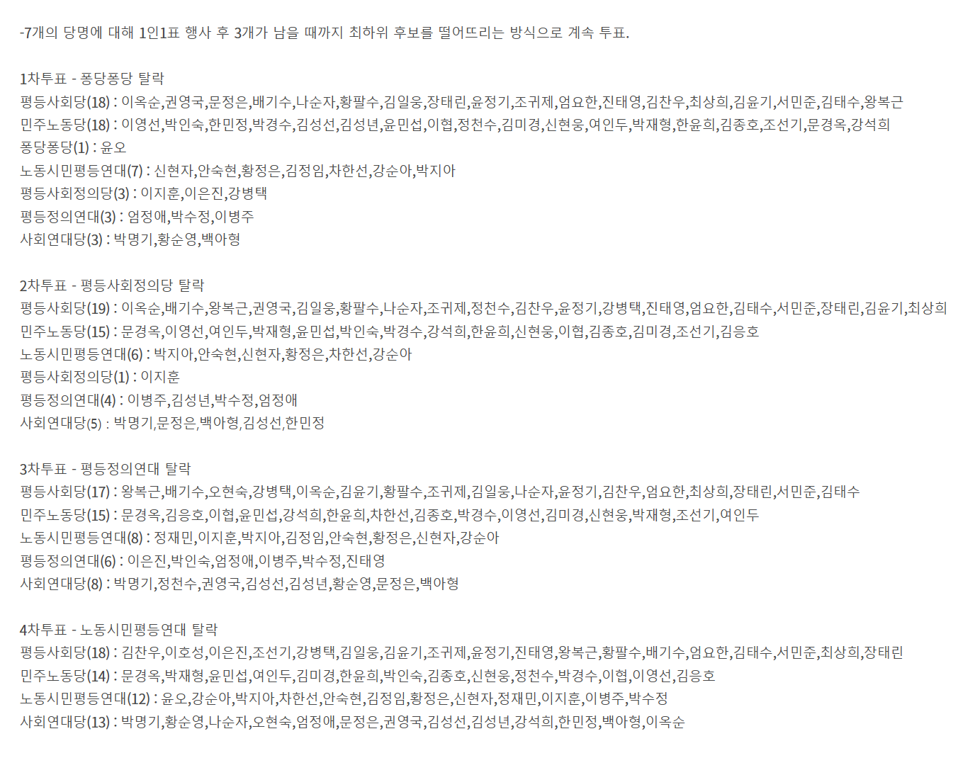 정의당은 4월 14일부터 당명 개정을 위한 당원 의견수렴 절차에 들어갔고, 22일까지 당 홈페이지에서 당원들로부터 당명 제안을 받았다. 이 글이 송고되는 현재는 의견수렴 기간이 끝나고 광역시도당위원장 연석회의와 전국위원회의 토론 및 투표를 통해 3개의 당명이 이미 선택된 상태다. 연대회의 측에서는 '가자 평등으로(약칭 평등당)'라는 당명을 사전에 제안한 바 있고, 여기에 당원들이 제안한 당명 후보 중 선택된 3개의 당명을 포함하여 모두 4개의 당명에 대한 검토를 진행한다. 이어 오는 27일(일) 있을 정의당 당대회에서는 여러 개의 당명 후보를 대상으로 선호투표가 실시되며, 이 투표에서 1위를 한 당명이 최종 당명 후보가 되어 당원총투표로 찬반투표를 거친다. 당원총투표에서 당명개정안이 가결된다면 즉시 당명개정 절차가 이루어지며, 권영국 혹은 한상균 후보는 해당 당명으로 이번 대선의 후보로 출마할 예정이다.