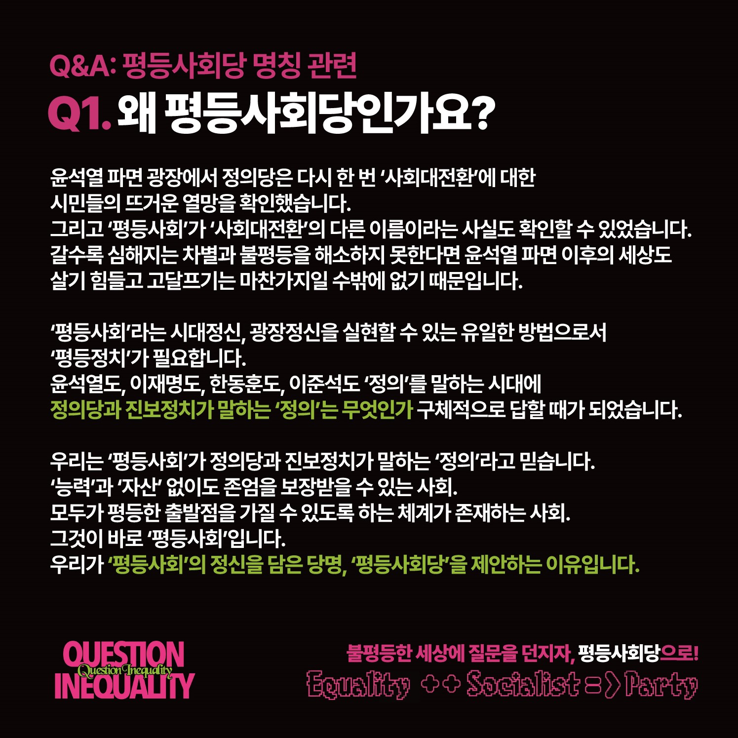 특히 청소년과 장애인, 성소수자, 그리고 지금은 외국인과 함께 마주치고 부딪히며 일하는 본인에게 있어 '평등'은 매우 중요한 가치이다. 평등을 국어사전에 치면 '권리, 의무, 자격 등이 차별 없이 고르고 한결같다'는 의미가 나온다. 하지만 본인과 본인을 둘러싼 많은 사람들에게 있어서는 전혀 그 가치가 실현되지 않고 있는 곳이 대한민국이다. 좋아하는 사람과 편히 손잡지 못하고, 자신이 지지하는 정치인에게 투표했다고 비난받고, 원하는 곳을 가고 싶어도 가지 못하는 - 그런 사람들이 여전히 자리하고 있는 것이 대한민국의 현실이다. 본인을 포함한 평등사회당 공동제안자들은 '평등사회'를 실현하고, 시민들에게 평등사회로 가기 위한 상상력을 불어넣는 것이 진보정치 세력의 사명이라고 생각하며 이에 평등사회당을 정의당의 새로운 이름으로 주장하고 있다.