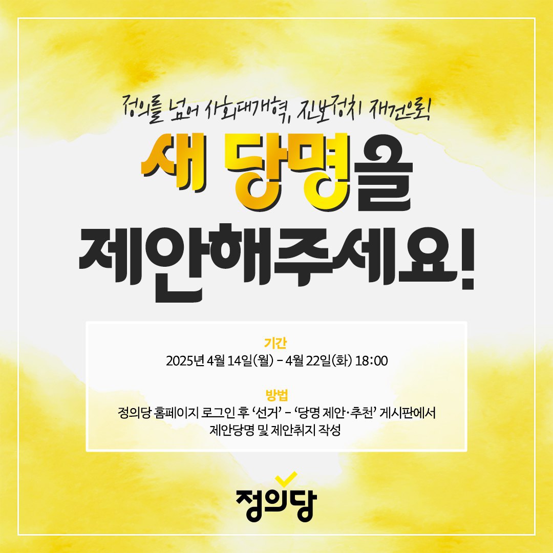 정의당은 4월 14일부터 당명 개정을 위한 당원 의견수렴 절차에 들어갔고, 22일까지 당 홈페이지에서 당원들로부터 당명 제안을 받았다. 이 글이 송고되는 현재는 의견수렴 기간이 끝나고 광역시도당위원장 연석회의와 전국위원회의 토론 및 투표를 통해 3개의 당명이 이미 선택된 상태다. 연대회의 측에서는 '가자 평등으로(약칭 평등당)'라는 당명을 사전에 제안한 바 있고, 여기에 당원들이 제안한 당명 후보 중 선택된 3개의 당명을 포함하여 모두 4개의 당명에 대한 검토를 진행한다. 이어 오는 27일(일) 있을 정의당 당대회에서는 여러 개의 당명 후보를 대상으로 선호투표가 실시되며, 이 투표에서 1위를 한 당명이 최종 당명 후보가 되어 당원총투표로 찬반투표를 거친다. 당원총투표에서 당명개정안이 가결된다면 즉시 당명개정 절차가 이루어지며, 권영국 혹은 한상균 후보는 해당 당명으로 이번 대선의 후보로 출마할 예정이다.