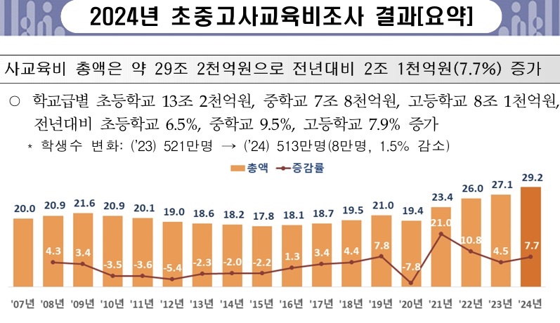- 연합뉴스, 학생수 줄었는데 2조 더 썼다…작년 사교육비 29조2천억 '역대최고', https://www.yna.co.kr/view/AKR20250313063400530 [본문으로]