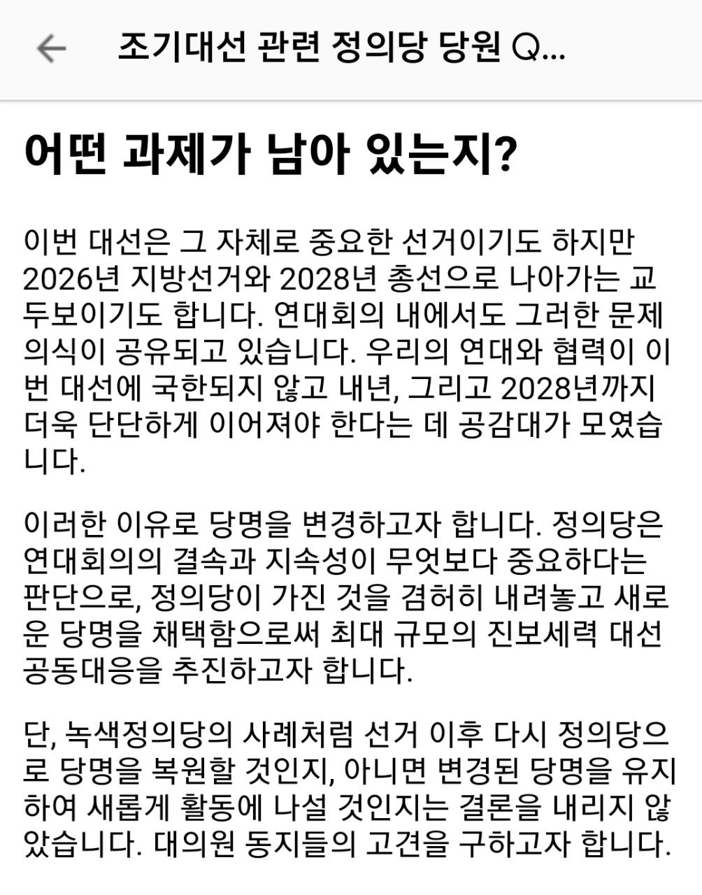 지난 4월 10일 정의당이 당원 대상으로 발송한 문자에 따르면, 연대회의는 '연대와 협력이 이번 대선에 국한되지 않고 내년, 그리고 2028년까지 더욱 단단하게 이어져야 하는 데 공감대'를 모아냈고[각주:1] 정의당 역시 이에 따라 연대회의의 결속과 지속성을 위해 새로운 당명을 채택하기로 했음을 밝혔다. 다만 과거 녹색정의당의 사례처럼 선거 후 다시 정의당이라는 당명으로 회귀할 것인지, 혹은 새로운 당명으로 향후 활동을 이어나갈 것인지는 아직 미정인 상황이다. 앞서 정의당은 2016년 '민주사회당'으로의 당명 개정을 추진한 바 있으나 당시 당원총투표에서 부결되어 무산되었다.