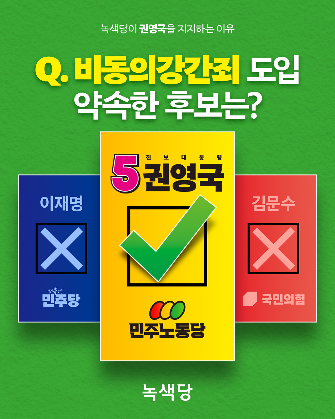 - R(녹색당): 아무래도 녹색당은 사회대전환 대선 연대회의에는 참여하지 않기로 하되 독자적 진보 후보를 지원하고 지지하기로 결정을 한 바가 있었기 때문에 저도 파견을 가거나 하는 건 없었는데요, 다만 이것이 우리 모두의 선거라는 생각은 당원들이든 당직자들에게든 있었던 것 같아요. 그래서 선본에 파견을 안 나가 있는 상황에서 이 자리에서 녹색당 홍보팀장으로서 할 수 있는 게 무엇일까 생각을 했을 때, 특히 마지막 일주일은 일상적 당 업무들이 아니라 권영국 후보를 지지하는 홍보물 제작에 집중했던 것 같아요. 특히 차별금지법 제정을 유일하게 약속한 후보 권영국을 지지한다는 홍보물이라던지, 후보별 비동의강간죄 수용 여부나 여성 정책의 차이들을 정리해서 홍보물을 만들고 했었죠.