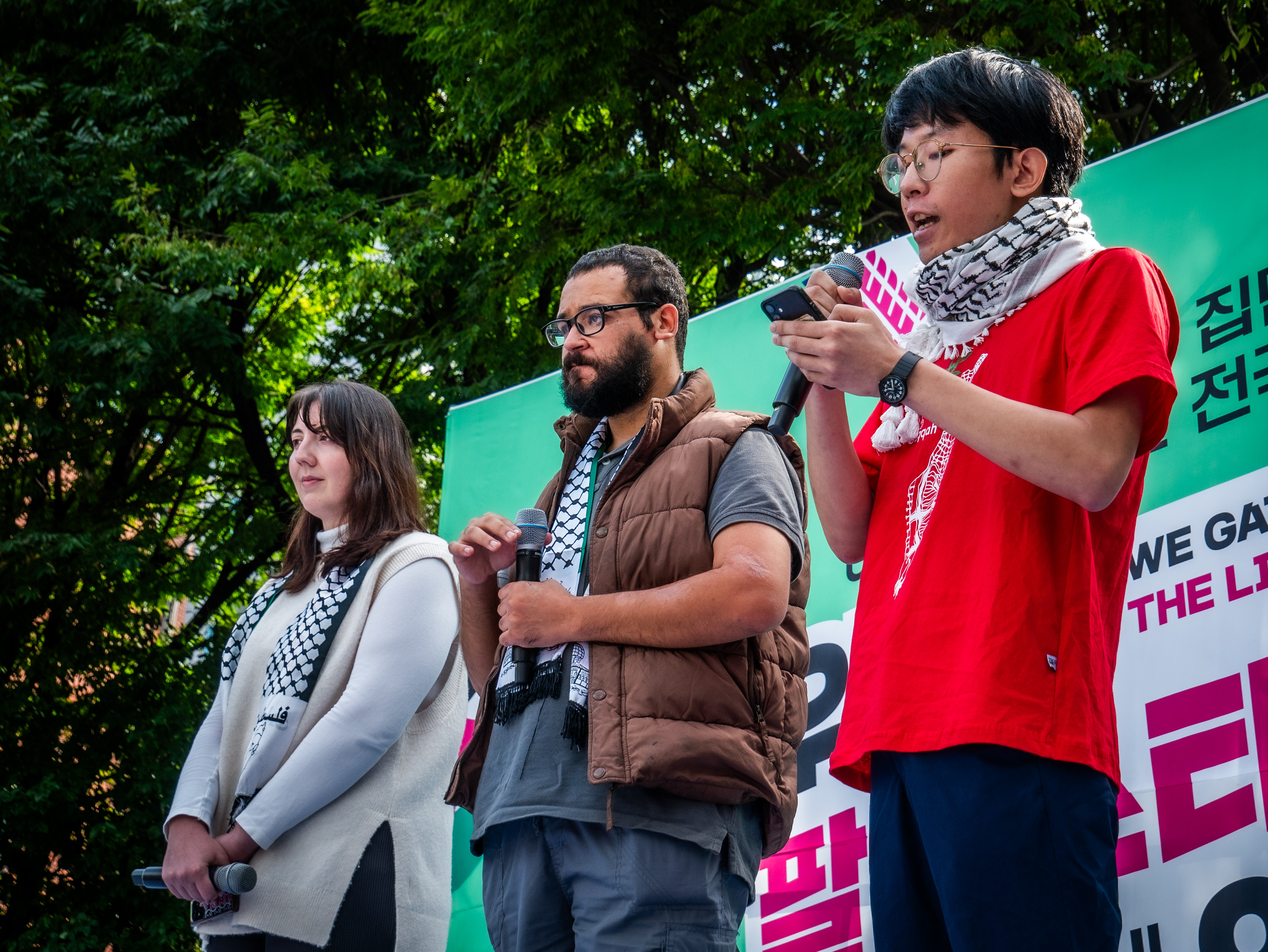 집회 현장에서는 가자지구 출신 난민 살레 씨, 서안지구(웨스트 뱅크) 출신 난민 키리야 씨 등 한국에 거주하는 팔레스타인 디아스포라(Diaspora)들의 발언을 비롯해, 참여연대 평화군축센터의 이영아 활동가, 퀴어팔레스타인연대의 타리 활동가 등 다양한 분야에서 활동하는 활동가와 시민들의 연대발언이 이어졌다. 다음은 가자지구에서 이스라엘에 의해 가족과 토지를 잃은 살레 씨의 발언 전문이다.