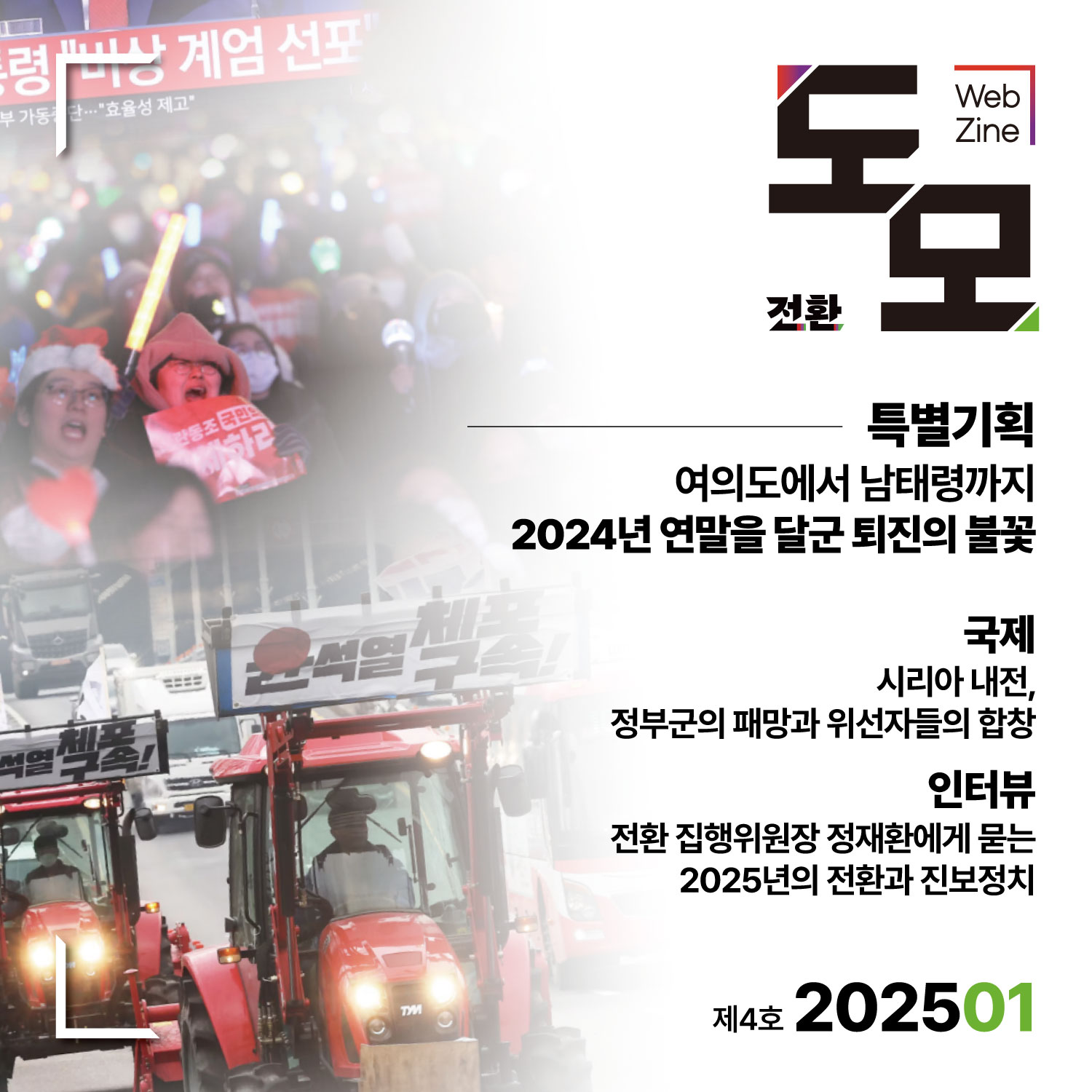 계엄과 내란이라는 초유의 사태로 인해 한국에서 크게 주목받지는 못한 이슈이지만, 2011년부터 얼마 전까지 무려 14년 동안 이어진 시리아 내전이 아사드 정부의 붕괴로 사실상 종결되었습니다. 일촉즉발의 전쟁위기로 다가가는 세계, 국제 면의 <시리아 내전, 정부군의 패망과 위선자들의 합창>은 세계의 관심사 밖으로 멀어진 2024년의 시리아에서 무슨 일이 벌어지고 있는지 담아냈습니다. 이외 거대한 저항의 시대 항상 함께했던 민중미술의 역사를 담은 <저항의 미술, 인간의 미술: 태동기>, 전환의 젊은 신임 집행위원장이 생각하는 2025년 진보정치를 담은 인터뷰 <전환 집행위원장 정재환에게 묻는 2025년의 전환과 진보정치>에도 많은 관심을 가져 주셨으면 좋겠습니다.