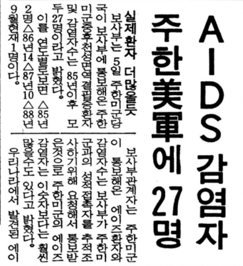 - 「AIDS 감염자 주한미군에 27명」, 『동아일보』, 1988.10.5. 13면. [본문으로]