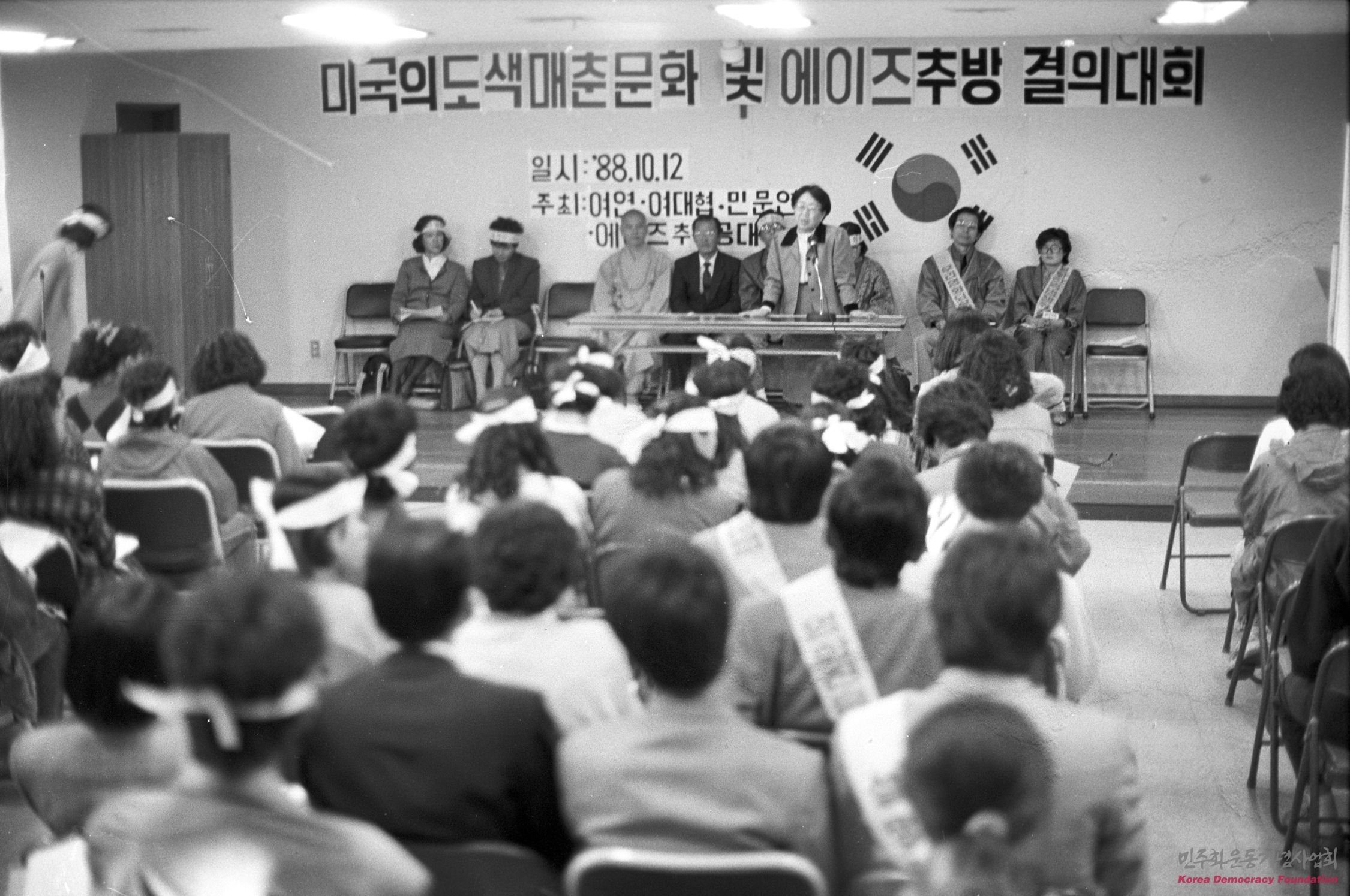그리고 이러한 시각이 가장 직접적으로 드러났던 사례는 바로 1988년 10월 12일, 여성단체들과 공대위 중심으로 열린 '미국 도색매춘문화 및 에이즈추방 결의대회'였다. 이 대회는 한국에 도색문화, 매춘문화를 퍼트리는 원인을 주한미군과 미국 영화로 규정하였으며, 미국의 타락한 문화를 통한 제국주의적 침략으로부터 한국의 민족자주성을 지켜야 에이즈도 방어할 수 있다는 주장을 했다. 이를 위해서 대회의 주최자들은 주한미군의 에이즈 검사 의무화와 에이즈 검사 양성 판정 외국인의 즉시 본국 송환을 주장했고, 미국 영화를 미국 영화사들이 직접 배급하는 것을 허용해서는 안 된다고 주장하며 '미국 영화 안 보기 운동'을 호소했다.14