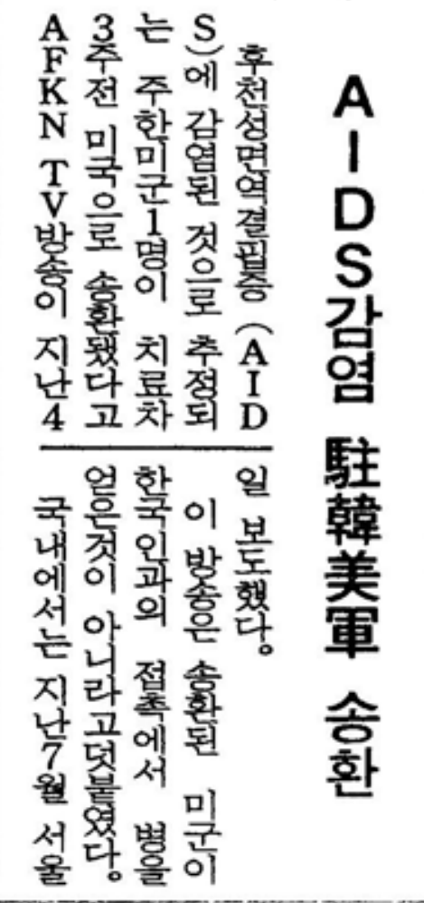 - 「AIDS 감염자 주한미군에 27명」, 『동아일보』, 1988.10.5. 13면. [본문으로]