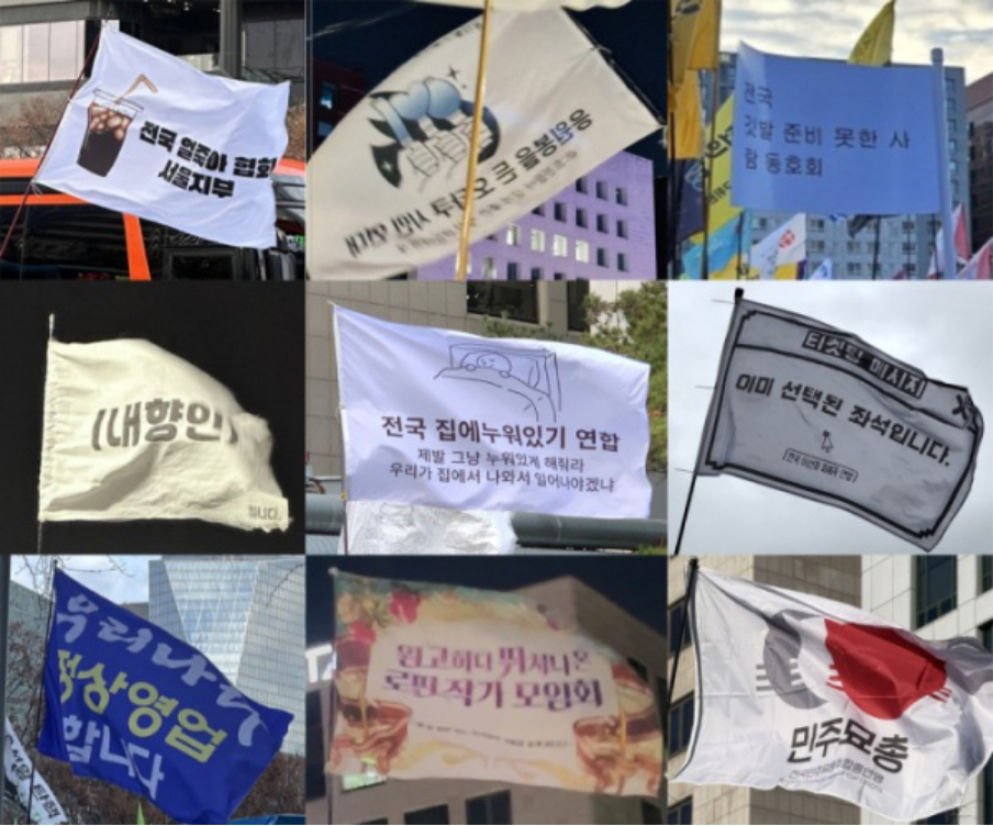 또 2016년에는 '깃발'에 대한 자제를 요구했었는데 이번에는 처음부터 깃발에 대한 제한이 없었습니다. 노동조합 깃발이든, 정당이나 단체 깃발이든 또는 개인이 들고 나오는 깃발이든 오히려 마치 깃발 경연대회가 벌어지는 것처럼, 굉장히 다종다양한 목소리들이 누구도 배제되지 않는 상태로 자유롭게 이야기하고, 또 자신을 드러내고. 이런 것들을 보면 다양한 부분들이 오히려 조화롭게 섞이고 또 자연스럽게 조장되는 광장으로 발전한 것 아닌가 하는 생각이 듭니다. 이런 헤게모니가 응원봉 문화로까지 연결되어 들어갔고, 오히려 과거에 광장의 핵심이던 중년 또는 남성 중심의 조직된 집단들이 이제는 이 헤게모니를 따라가고 있는 것이 현재의 상황인 것이죠.