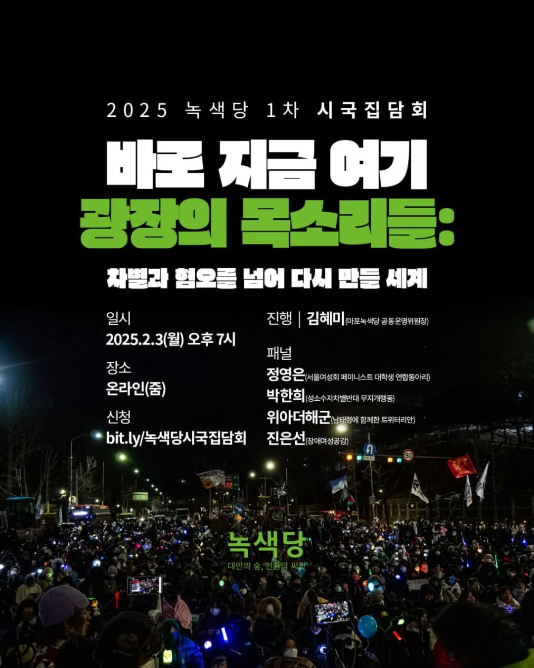 어쨌든 진보정당들이 먼저 선거 기조나 목표, 전략 등을 합의하는 게 가장 중요합니다. 그래서 일단 진보 3당과 사회운동 세력 사이에 공유되는 대략의 기획이 마련되고 나면 거기에서부터 또 구체적인 논의가 전개될 수 있지 않을까 싶고, 지금 녹색당 같은 경우에는 아직 대선에 대한 전술적인 문제보다는 어떻게 이 연대를 강화하면서 광장 시민들과 만나고 사회의 전망을 만들어낼 수 있을지를 집중적으로 이야기하는 중입니다. 그래서 우선 이 광장에서의 목소리를 녹색당의 정치적 과제와 연결시키기 위해 연속 시국집담회를 진행하는 중이고요. 1회차는 지난 2월 3일에 차별과 혐오를 넘어 다시 만들 세계라는 주제로 진행했고 2회차는 다음 금요일인 21일에 기후정의를 주제로 진행할 예정입니다.