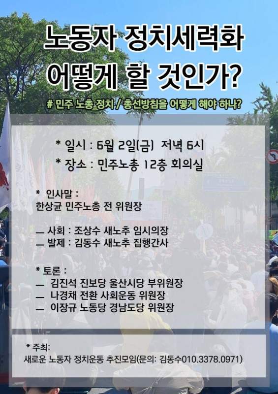 작년 총선 당시에도 민주노총 중심의 연합정당론을 제기했지만 실패했고, 이후 야권연대와 위성정당 참여에 관한 문제로 불거진 내부 갈등은 여전히 해소되지 못하고 있습니다. 정치적으로는 진보정당들이 완전히 존재감을 상실한 상황이 이어지고 있고, 이런 상황까지 오게 된 것에 대한 비판과 성찰을 기반으로 하여 독자적 노동자 정치세력화의 새로운 판을 도모해야 함에도 민주노총의 존재감을 찾아보기 힘든 상황입니다.