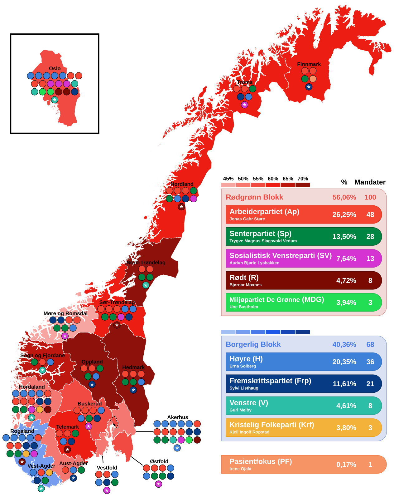 | 동남부 | 외스트폴 (Østfold) | 바이오리파이너리, 펄프·제지, 항만 | 동률(표) | 47.6 : 47.6 (의석은 적·녹 5, 우파블록 4) |