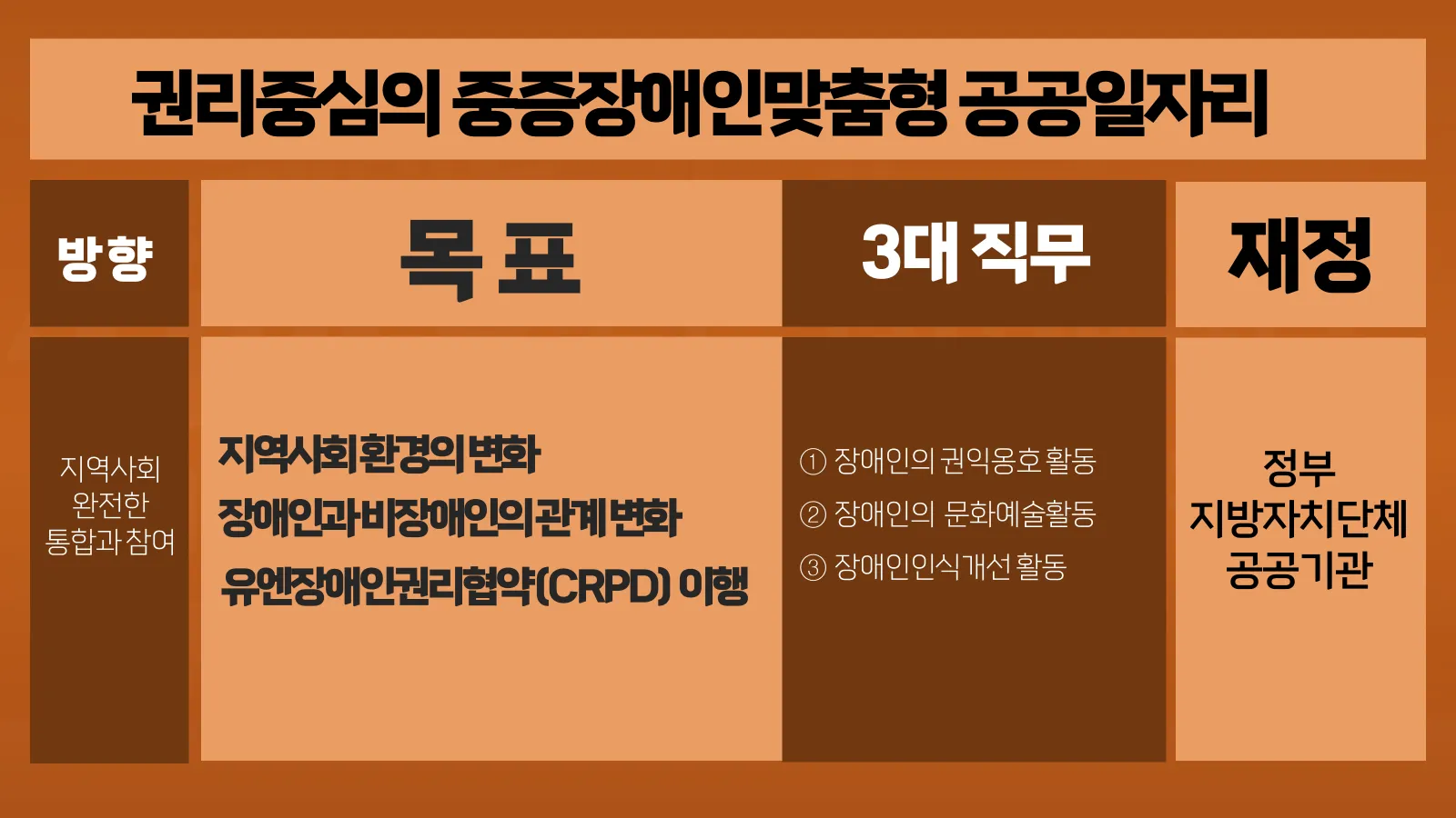 장애인권리보장법 | 장애인을 복지의 대상이 아니라 권리의 주체로 보고, 유엔 장애인권리협약(CRPD)을 기반으로 장애인의 자립생활, 지역사회 통합, 권리 옹호를 체계화 |