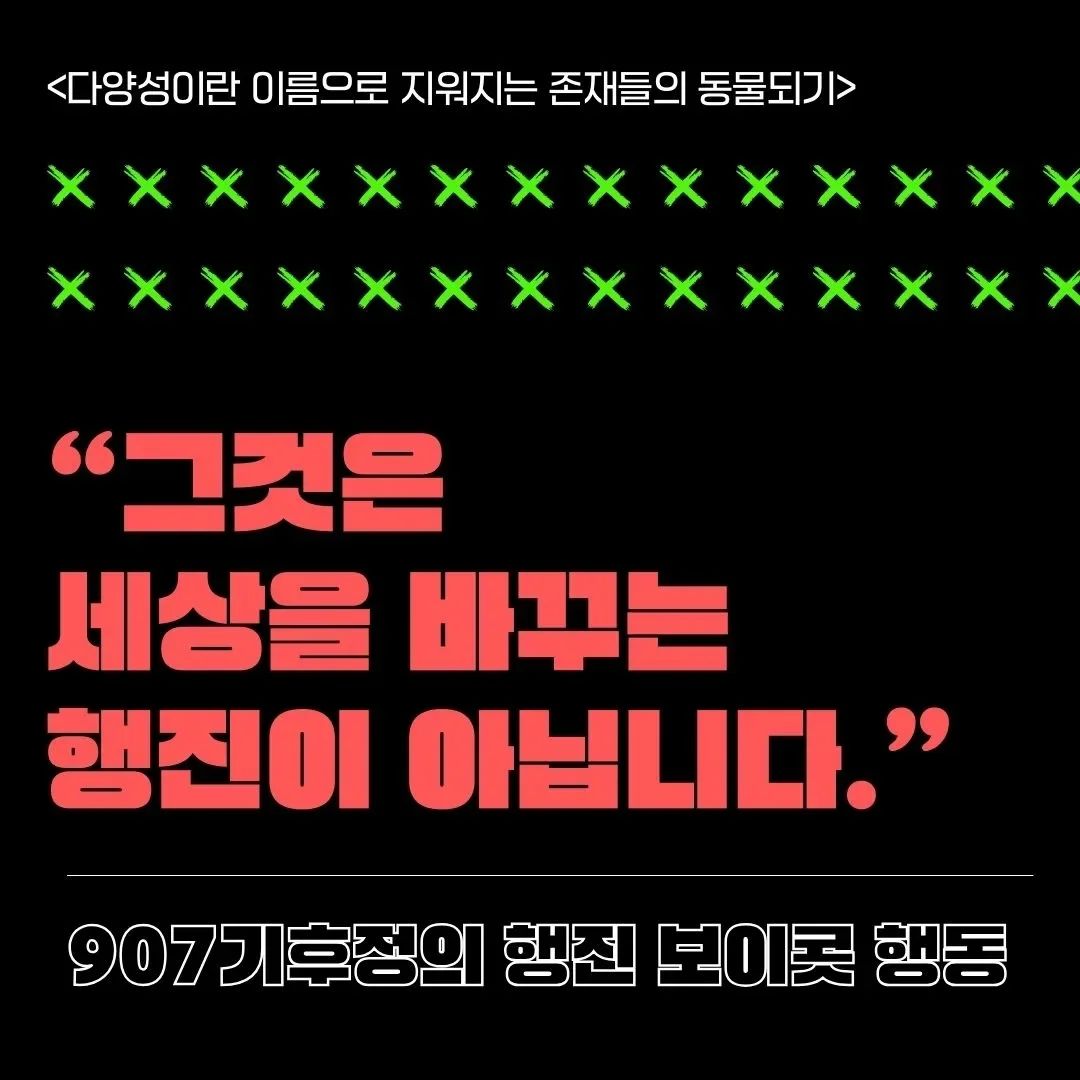 이들의 말처럼 기후정의운동이 정말로 ‘정의’로우려면 이미 주류화된 기성사회의 ‘녹색’담론에서 한 발짝 더 나아가는, ‘적색을 더한 녹색성장’ 수준을 넘어 인간지배 자본주의 체제 내에서 우리의 위치를 비판적으로 되돌아보고 이로부터의 총체적인 전환의 가능성을 숙고해야만 한다. 우리가 907 기후정의행진에 대한 긍정적인 기억들은 물론, 앞서 소개했던 논쟁적인 문제제기들 역시 외면해서는 안 되는 이유이다. “감옥 안에 단 하나의 영혼이라도 갇혀 있다면 나는 자유롭지 않다”고 말한 미국의 사회주의 정치인 유진 뎁스의 말을 빌려 말하자면, 지구상에 ‘기후 부정의’를 경험중인 존재가 단 하나라도 있다면, 우리의 기후정의운동은 미완성일 수밖에 없기 때문이다.