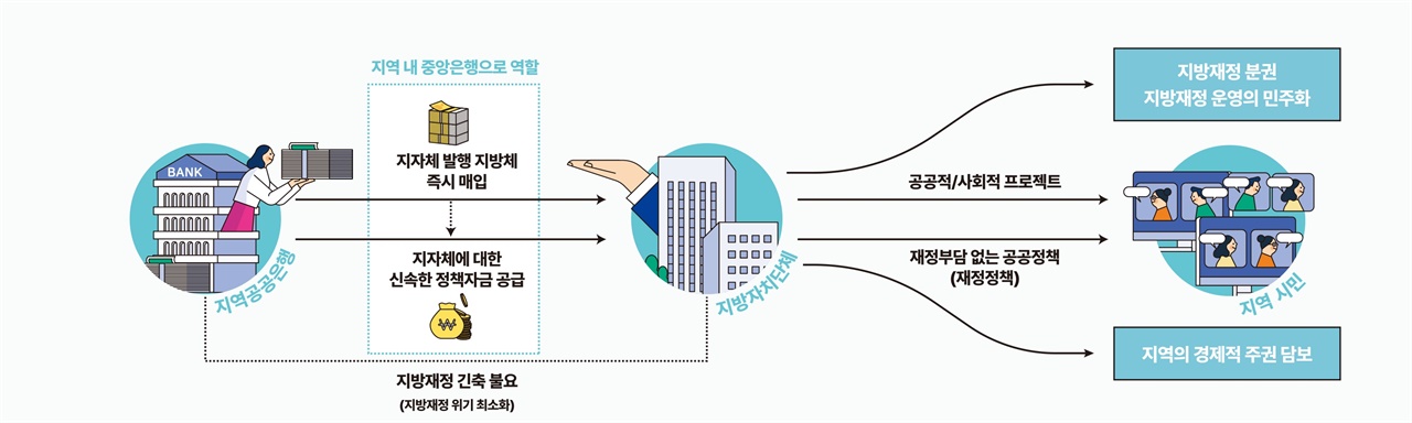 중앙정부의 입김에 따라 언제든 축소될 수 있는 20조 원의 일회성 보조금은 지방자치의 토대가 될 수도, 지역의 사회권을 확장할 수도 없다. 부가가치세의 지방 공유분인 지방소비세 비율을 현행보다 대폭 상향하거나, 소득세 및 법인세의 일부를 지방세로 완전 이양하는 등의 근본적인 재정 구조 개편이 선행되어야 한다. 특히 부가가치세의 지방소비세 배분 비율을 영구적으로 상향 조정하여 지자체가 예측 가능한 '자주 재원'을 확보하게 하는 것이 핵심이다. 지자체가 주도하는 ‘지역공공은행’을 설립하여 내생적 성장의 토대를 닦는 것 역시 지방자립의 핵심이다. 지역공공은행은 지역 내에서 창출된 부를 다시 지역의 소상공인과 사회적 경제 조직에 저리로 공급함으로써, 자본의 역외 유출을 막는 든든한 저수지 역할을 할 수 있다. 중앙권력이나 외부 자본의 변덕에 지역 노동자의 목줄을 맡기는 대신, 지역공동체의 회복력을 키우는 생산적 금융 시스템을 구축해야 한다.