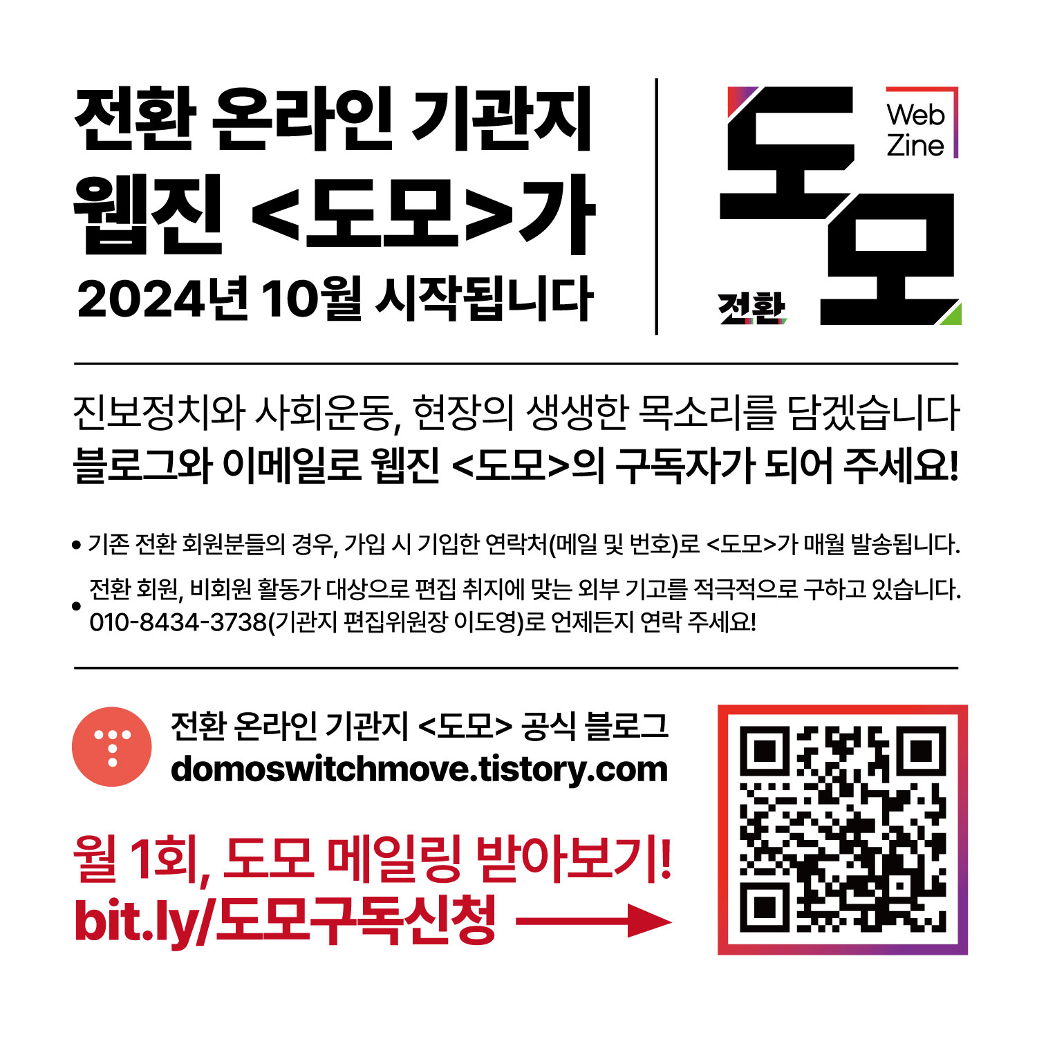 - 도모는 전환 회원, 비회원 활동가 및 진보좌파적 의제에 관심 있는 모든 분을 대상으로 편집 취지에 맞는 외부 기고를 적극적으로 구하고 있습니다. 기고 문의는 010-8434-3738(전환 기관지편집위원장 이도영)로 언제든지 연락 주세요!